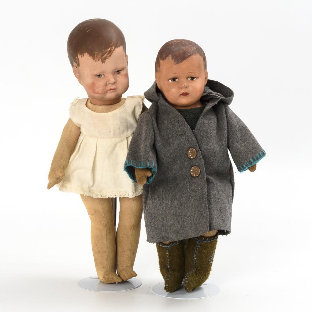 1x with painted crank head and fabric body with disk joints. In white undergarment. H 36 cm. / 1x with papier-mâché chest head and fabric body with splined limbs. In gray felt coat. H 33 cm. Worn, with signs of age and rubbing.