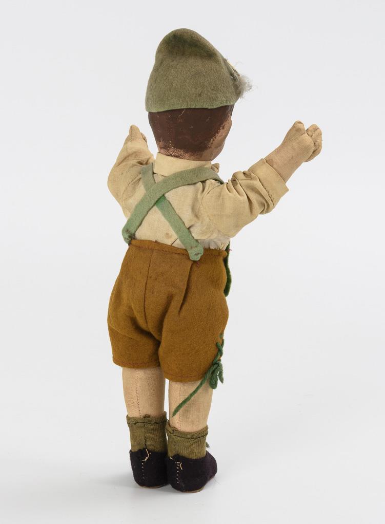 Small rag doll with painted head, eyelashes, brown hair, body with disc joints. In traditional costume with "lederhosen" made of yellow felt, Tyrolean hat and black shoes. Traces of age.