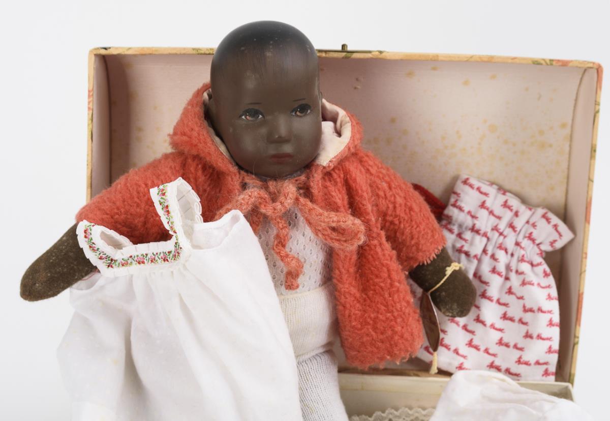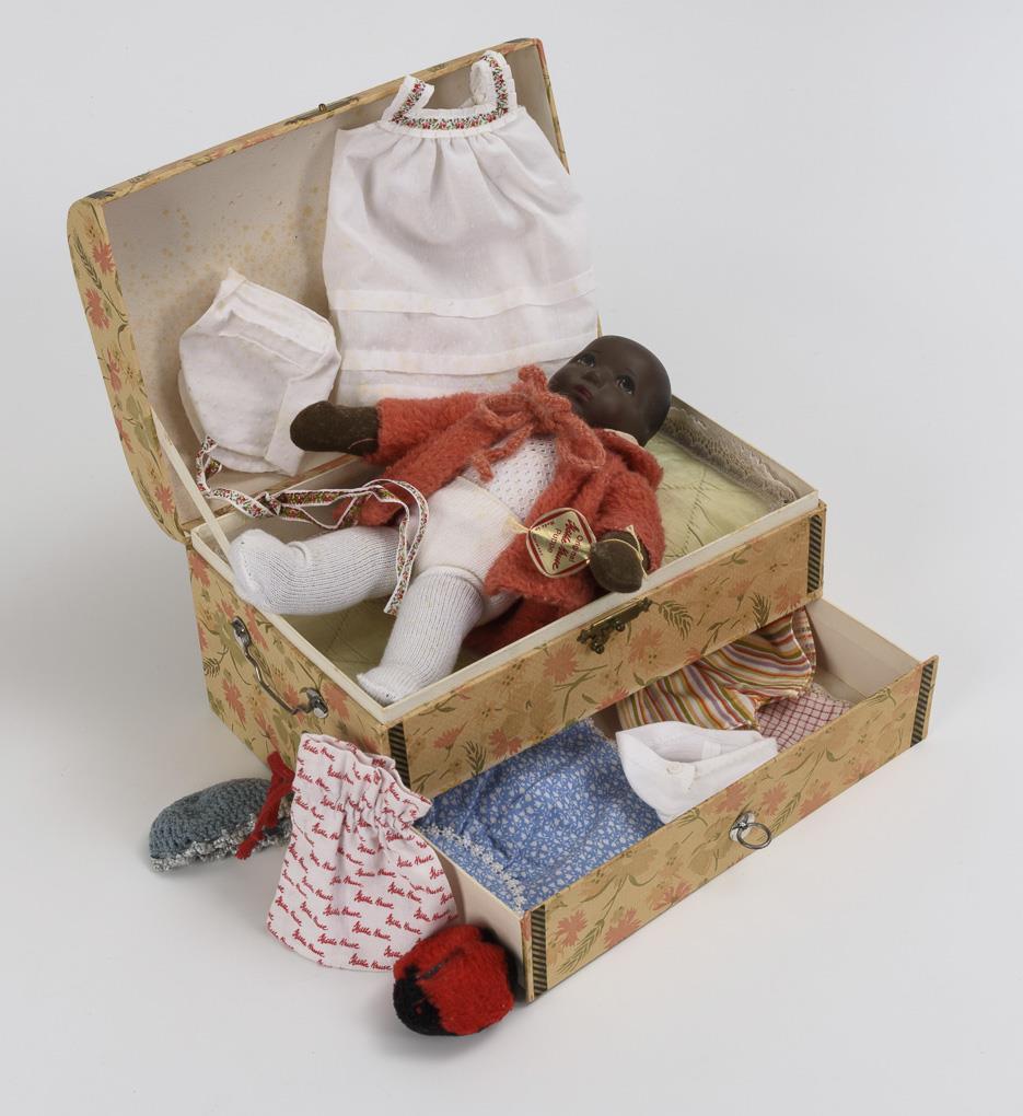 Black Thumbelina in trousseau with floral pattern. Käthe Kruse, model Hanne Kruse.