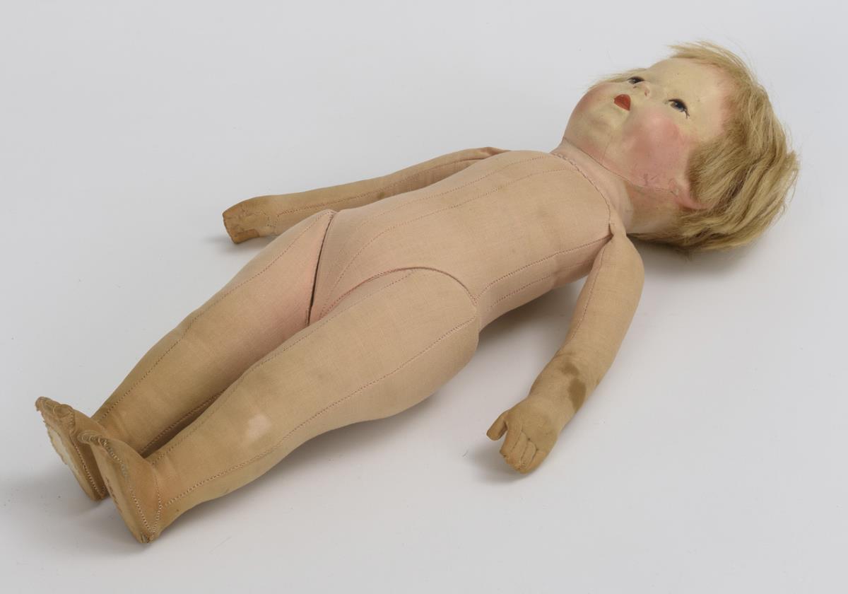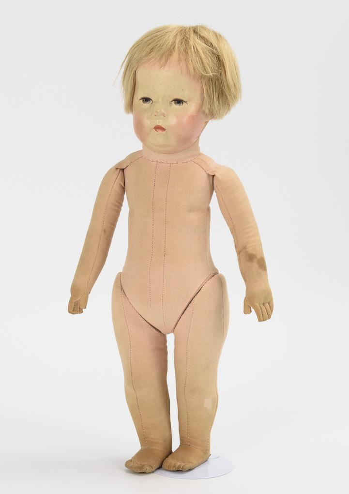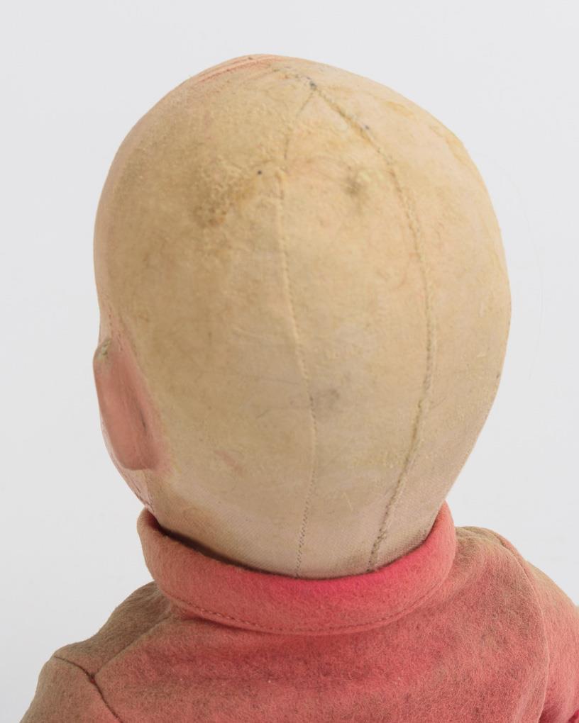 Mask-like painted fabric head with 3 seams at the back of the head. Fabric body with 5 leg seams and individually stitched thumbs. Red jacket, brown trousers, blue cap and wooden shoes. Face and clothing faded on the front, chin and cheeks retouched, arms and legs partly stained.
