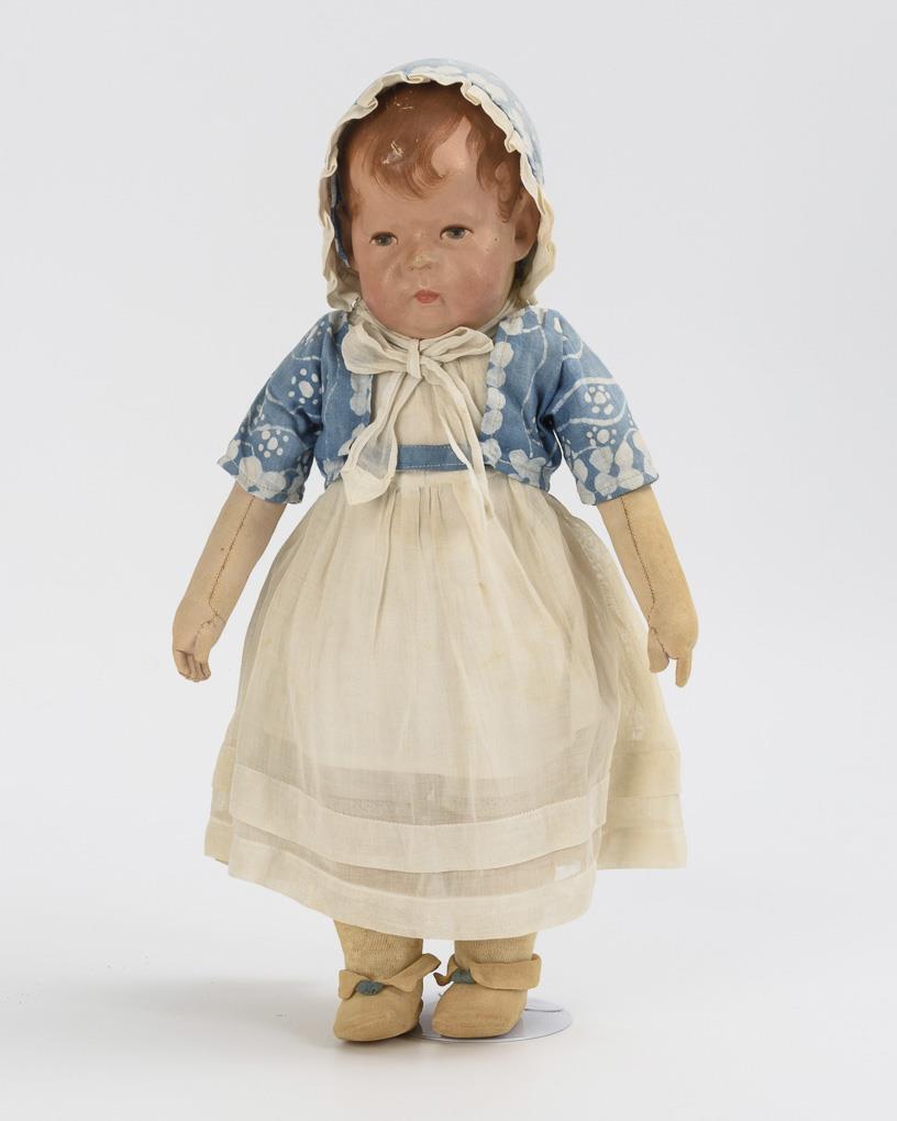 Cloth head with 3 seams on the back of the head, 2 seams on the chin and very beautiful face painting. Well-preserved fabric body with wide hips and individually stitched thumbs. In original clothing with a light blue jacket, matching hood and fabric shoes. Very good overall condition, head with age-related color detachment in the area of the hair painting. Does not glow under UV light.