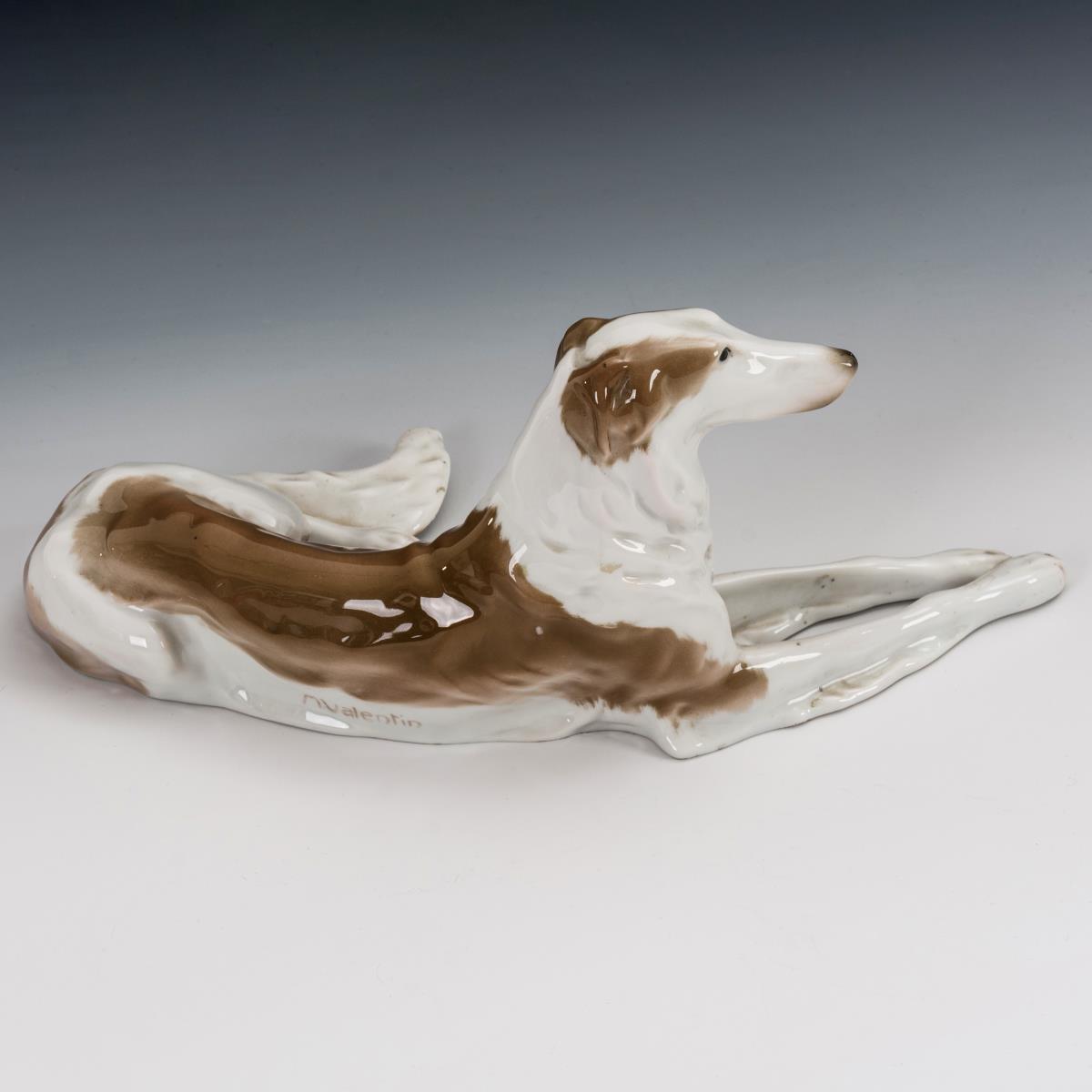 unter der Glasur staffierter Barsoi. H 11 cm, L 26,5 cm.