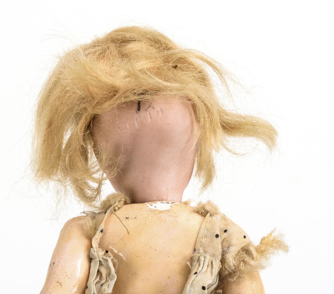 Cranked head, blue sleeping eyes, blonde mohair wig. 5-part standing doll body with modeled shoes. Light-colored dress with black dots. Head not x-rayed: no defects visible. Body with small color defect in the neck and 1 glued foot.