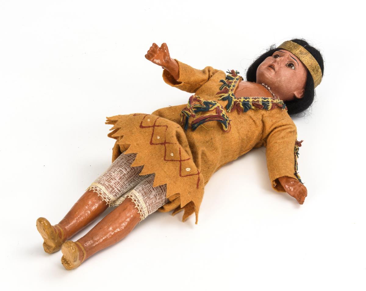 Both with tinted crank head, fixed brown glass eyes, black mohair wig, cardboard body and mass limbs. Woman in original dress (l 38 cm), smaller doll with yellow leather clothing in old style (l 27 cm). Head of the woman x-rayed: without defects, body with tear in the chest area. Head of the smaller doll not x-rayed: no defects visible.