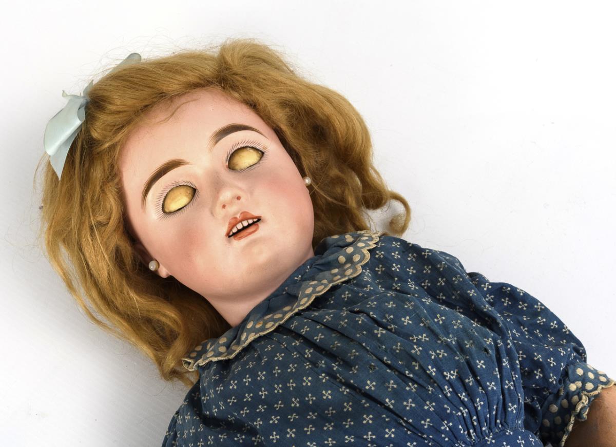 Cranked head, blue sleeping eyes, earrings, red-blonde mohair wig. 11-part articulated body with intact voice. Old blue print dress, chain bag, white stockings, without shoes. Head x-rayed: only short burn mark on the crown of the head. Body painted over, with color defects.
