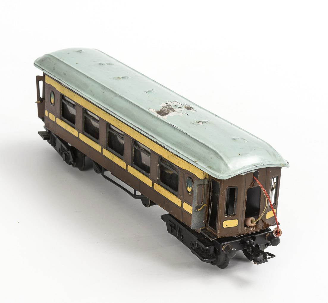 Gauge 0. Brown painted wagon with hinged roof, inside equipped with 3 tables and 6 chairs. Subsequently electrified. Paint defects.