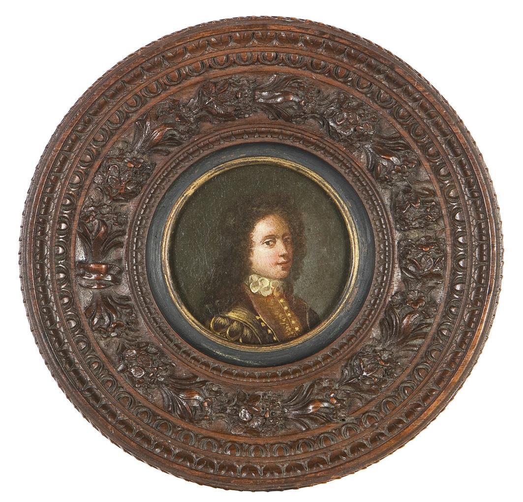 Portrait miniature in a magnificent 19th century frame. Wide carved mahogany frame with ornamental and floral decoration.