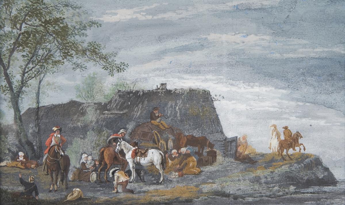 Small-format genre scene with many figures in the style of the Haarlem painters Pieter and Philips Wouwerman from the Golden Age of Dutch painting. Glazed blackened profile frame.