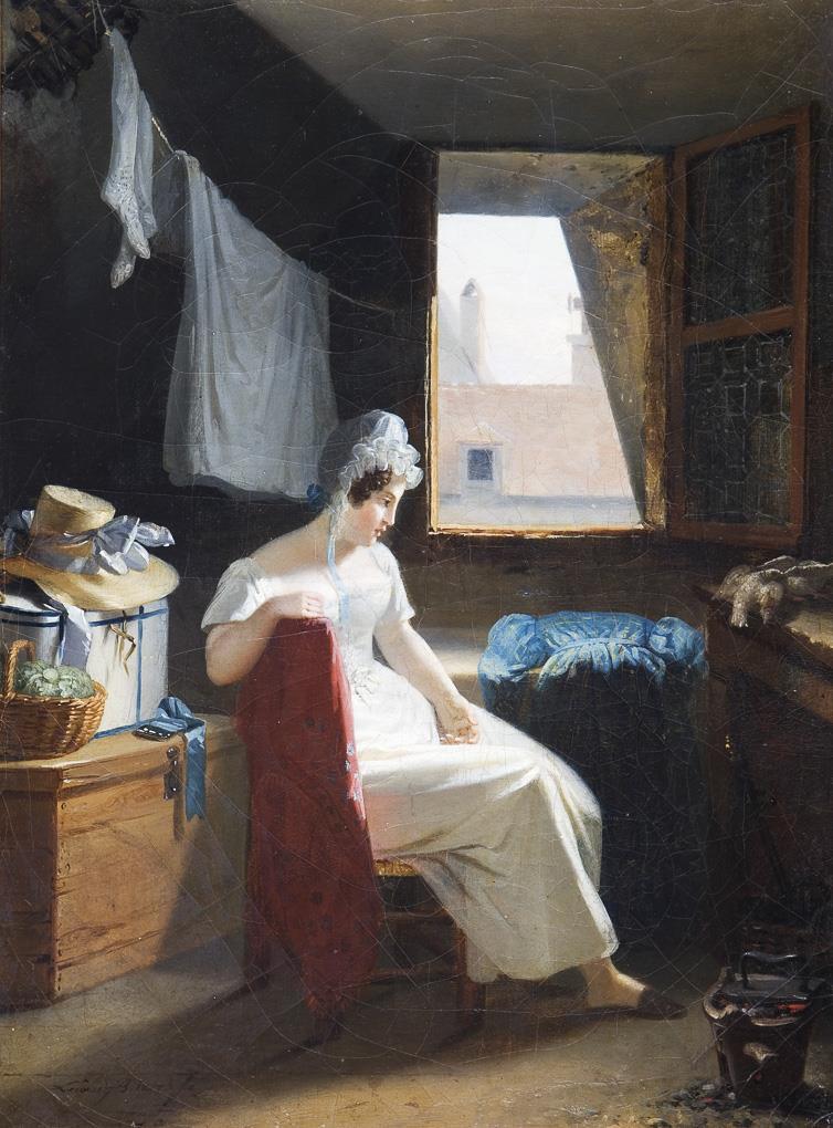 A sentimental motif with doves in a simple interior, a finely and precisely painted scene. Indistinctly dated. Gilt stucco frame. Craquelé.
