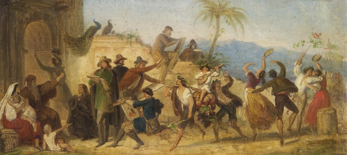 A lively scene full of figures with a varied depiction in a southern architectural landscape. Remains of an old adhesive label on the reverse. Elaborately worked profiled gold frame with gold ornamental decoration on a dark green background.