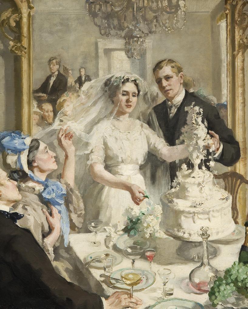 Multi-figured, extremely detailed, impressionistically painted scene in bright coloring. Next to the young bride and groom are the obviously emotional bride's parents, while the rest of the party and waiters can be seen in the huge wall mirror. Old English adhesive label on the stretcher: Ryman & Co, Ltd, Fine Art Dealers. Profiled frame, painted gold-grey-green-white.