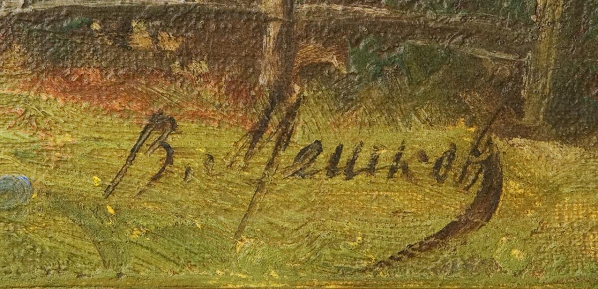 Decorative landscape composition in realistic painting style with realistic depiction of nature in bright coloring. Heavy, wide, gilt stucco frame with oak leaf and laurel leaf decoration.