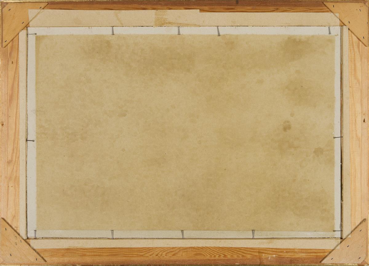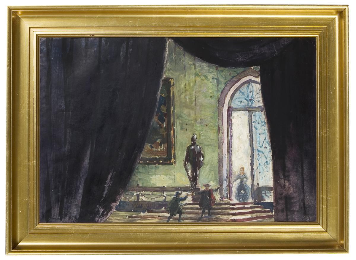 Scene with strong contrasts of light and dark, which serve to heighten both the spatial and the expressive. In the center is the subject in the light with the dark stage curtain framed at the side. Profiled gold frame.