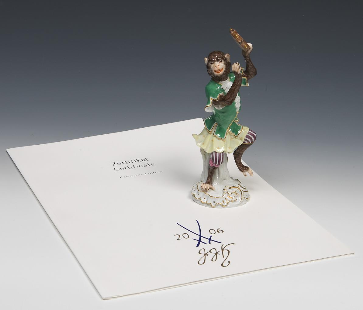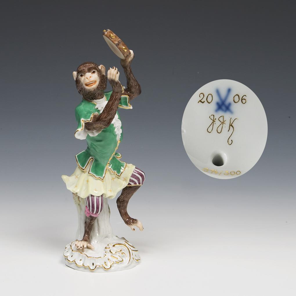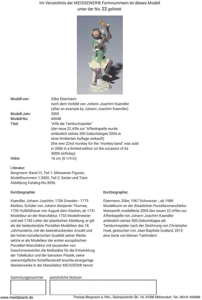 Ebermann, modeled at the Meissen State Porcelain Manufactory from 1988. In 2005, modeled the new 22nd monkey for Johann Joachim Kaendler's monkey chapel on the occasion of his 300th birthday as a tambourine player after the drawing by Christophe Huet, engraved by Jean Baptiste Guélard * partner auction Bergmann.