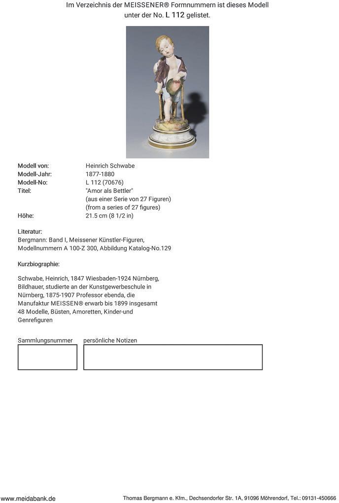 Schwabe, sculptor, studied at the School of Arts and Crafts in Nuremberg. Professor at the same from 1875-1907. The Meissen manufactory acquired a total of 48 models by 1899. Meissen manufactory price: 3990,- Euro * Partner auction Bergmann.