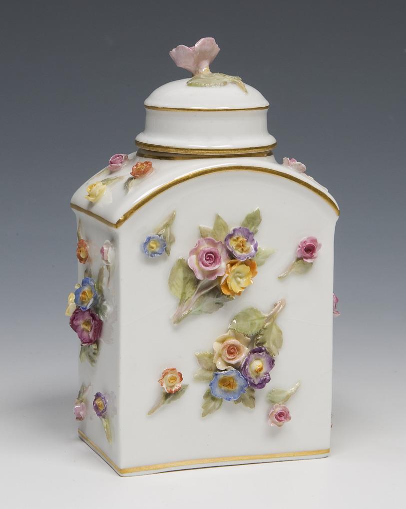 Tea caddy with plastic flower coverings. Meissen.