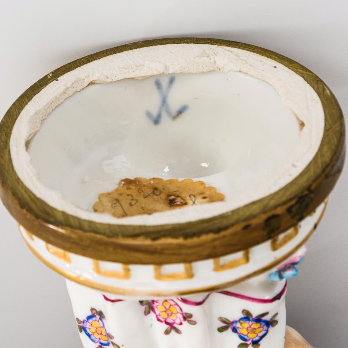 Polychrom bemalt, goldstaffiert; messinggefasster Rundsockel.
