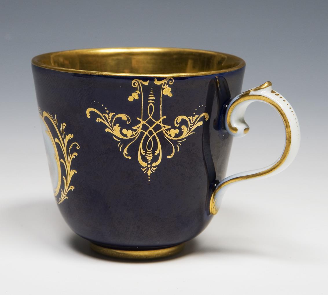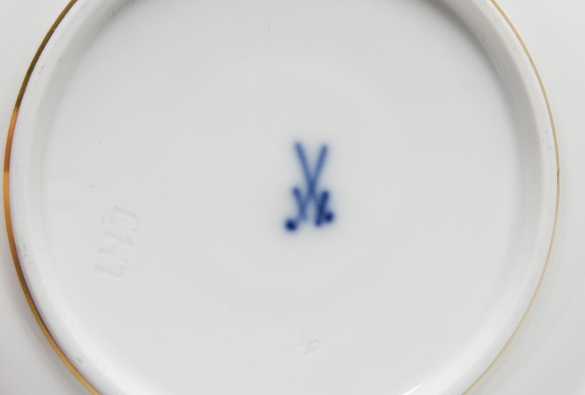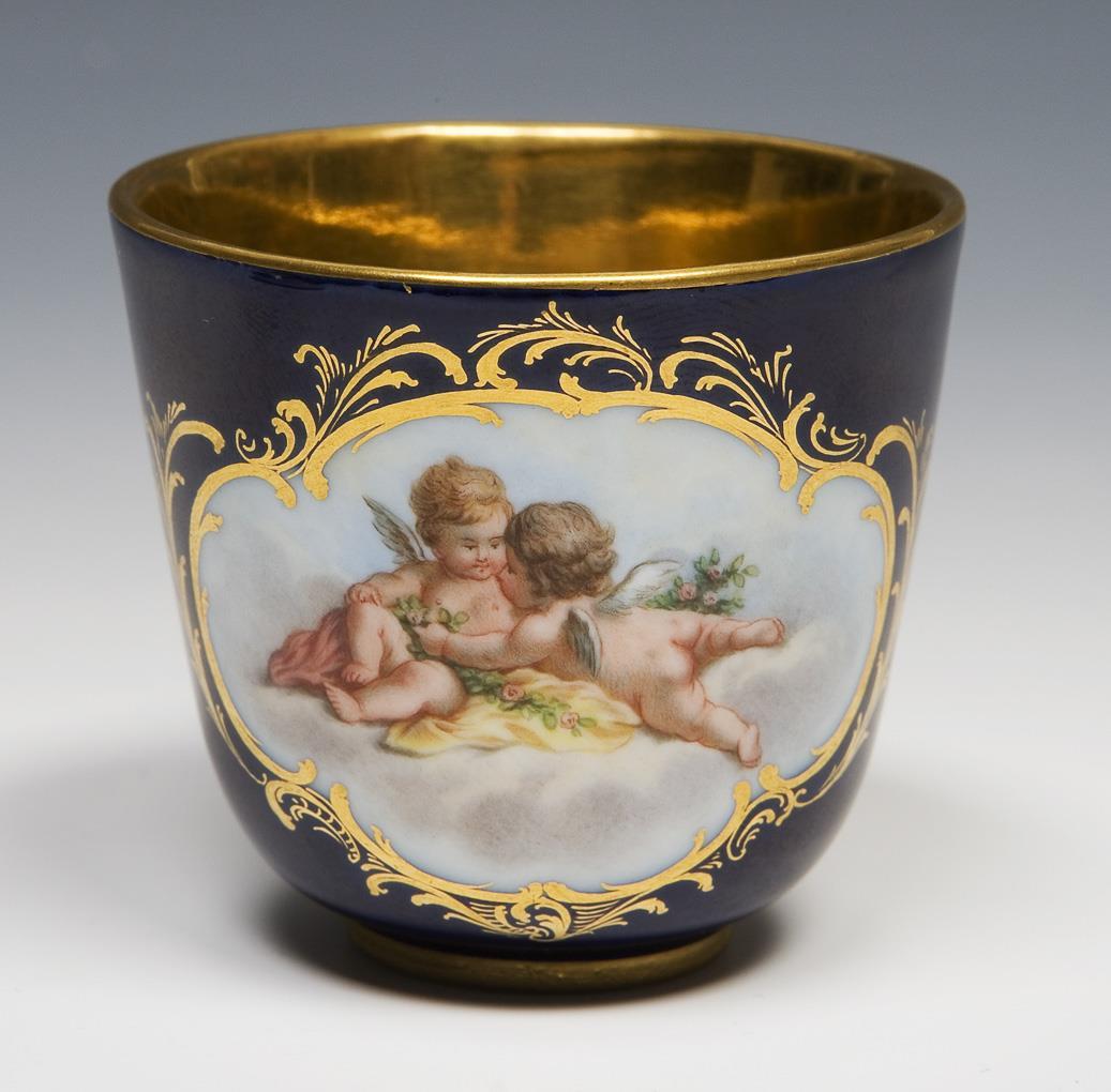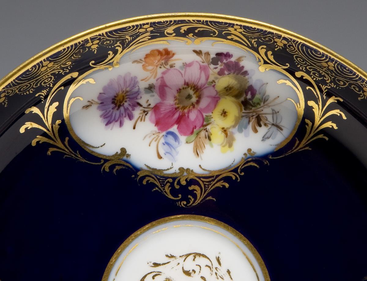 Shaped model by Ernst August Leuteritz and co-workers 1855-1860. Rich, sumptuous decoration, gold lace border, ornamental decoration in gold, gold staffage. In three reserves colored flower painting with insects, wall inside half gilded, frontal reserve with fine colored painting "Cupids on a cloud base" after a model by Francois Boucher (1703-1770). Press marks, sword marks.