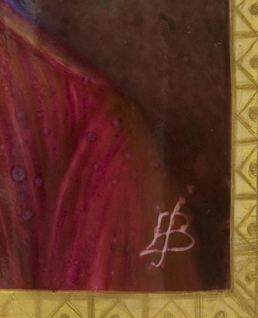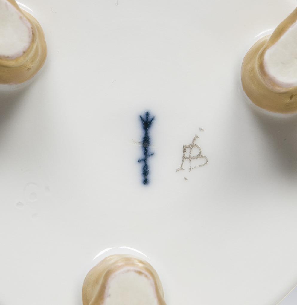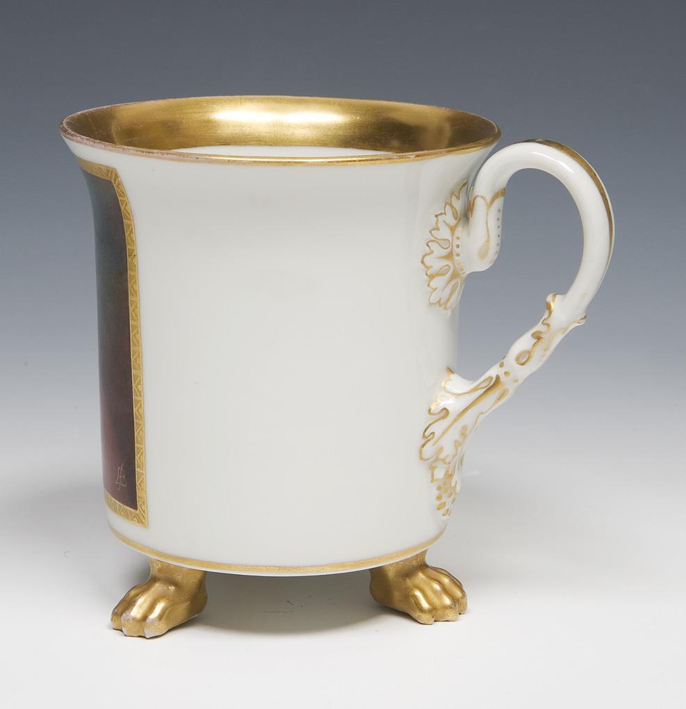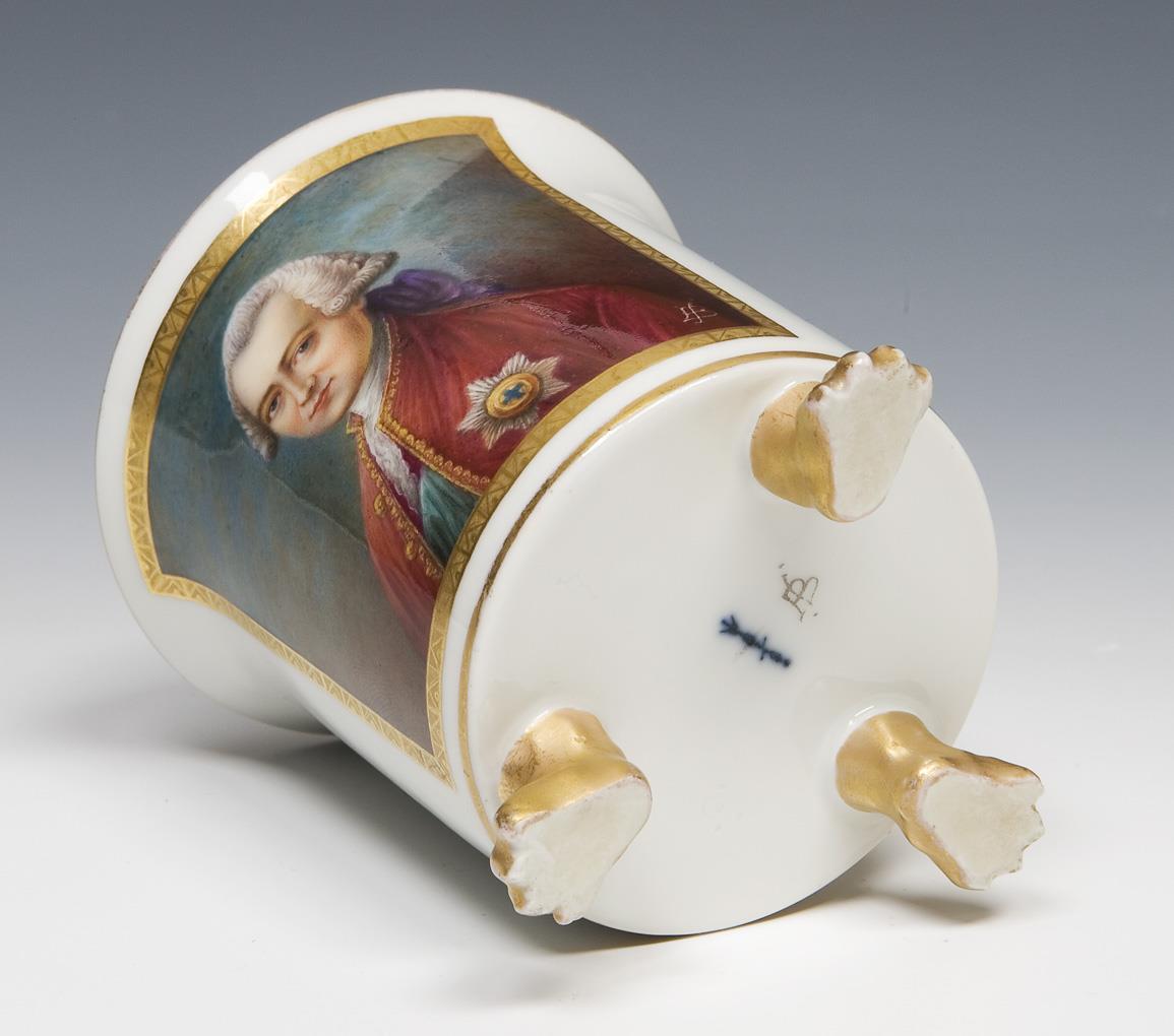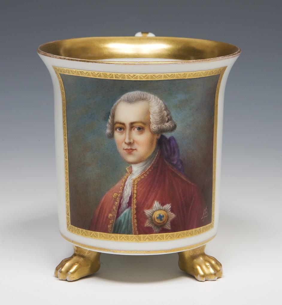 Gold decoration, front with very fine colored painting "Courtly portrait of a gentleman with medal". Cylindrical cup on three paw feet, ear handles in partial relief. Blue sceptre marks painted once, painter's monograms, impressed marks. Internal lip with scratches.