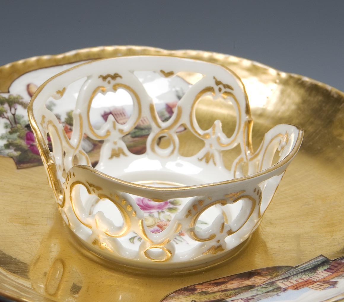Fine colored painting, in six fitting curved reserves "Galant couples in architectural landscapes", in the saucer mirror flower bouquet, back of the saucer with turquoise background. Cup in a slender cup shape with side handles, hollowed saucer with symmetrical openwork basket insert. Blue sceptre marks, gold painter's marks. Lid partially restored.