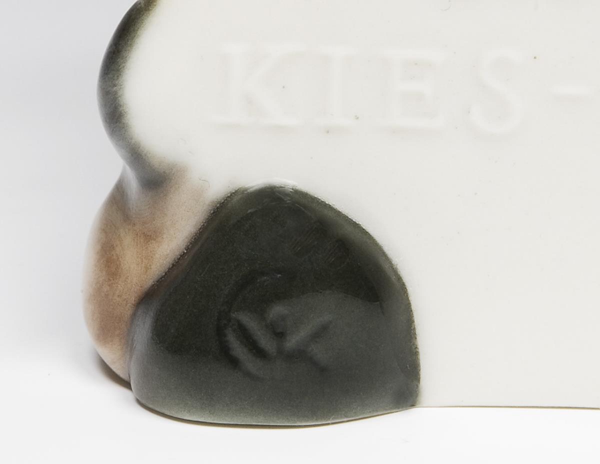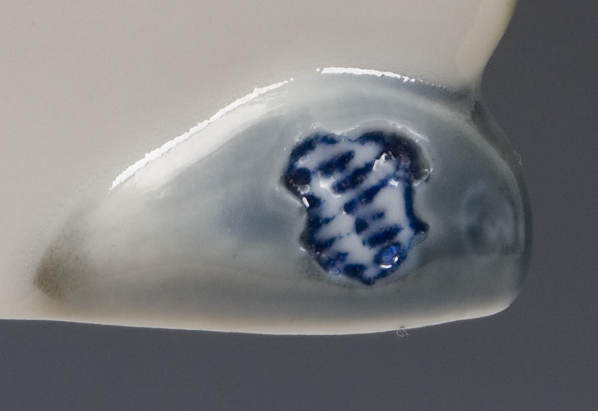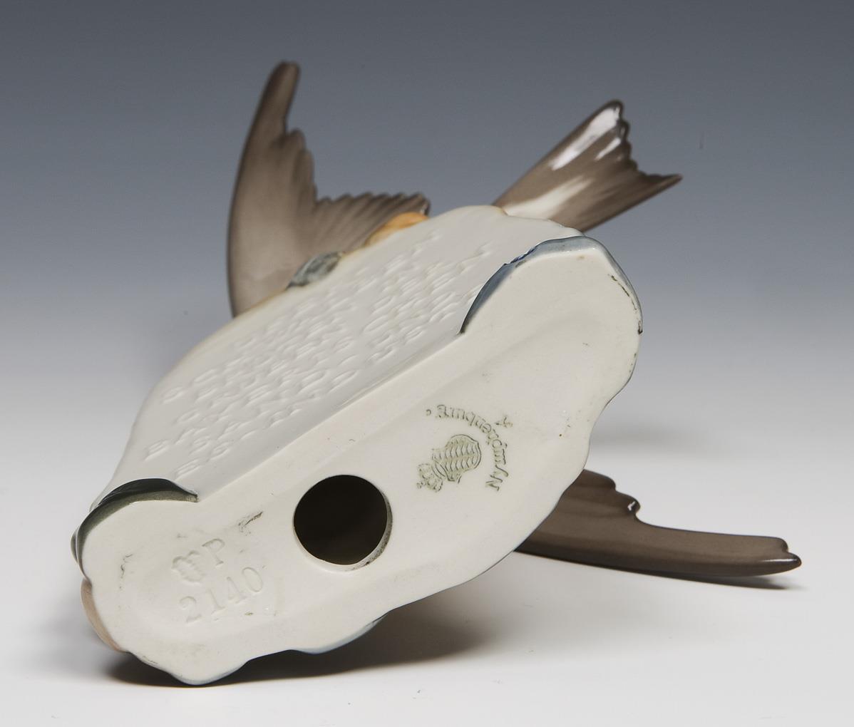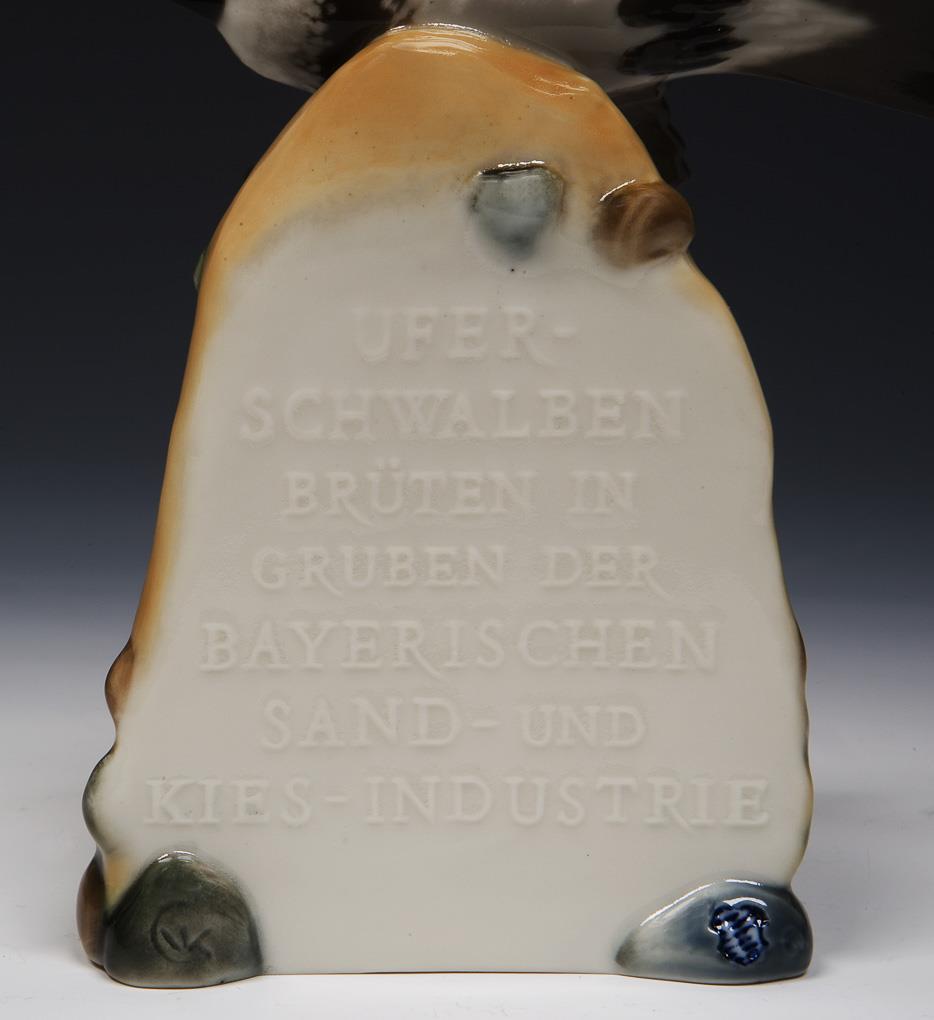 Model by Carl Vezerfi-Clemm 1985. Painted in color, relief lettering on the back: Sand martins breeding in pits in the Bavarian sand and gravel indurstry. Unglazed base, base mark with A for Duke Albrecht of Bavaria, impressed marks, artist's signet on the base, in original box. Minimal glaze defect.