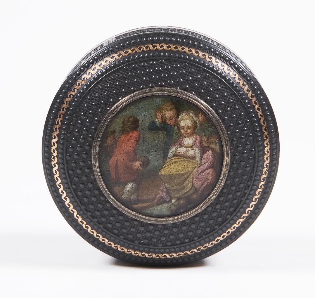 Colored floral straw marquetry on the inside. Applied round reserve on the lid with oil painting "Playing children". Round, bulging body with six golden wavy bands.