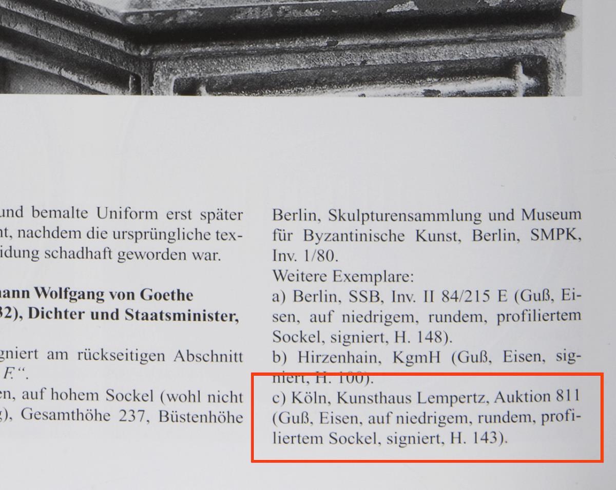 Goethe, 1749 Frankfurt am Main - 1832 Weimar, ennobled in 1782, one of the most important creators of German-language poetry. The bust made by Christian Daniel Rauch in 1820 served as a model, Posch completed the model in Weimar in 1827. Including the catalog raisonné "Leonhard Posch" 1750-1831, portrait modeller and sculptor by Anne Forschler-Tarrasch. Published by Willmuth Arenhövel, Berlin 2002. 284 pages with around 1050 illustrations.
