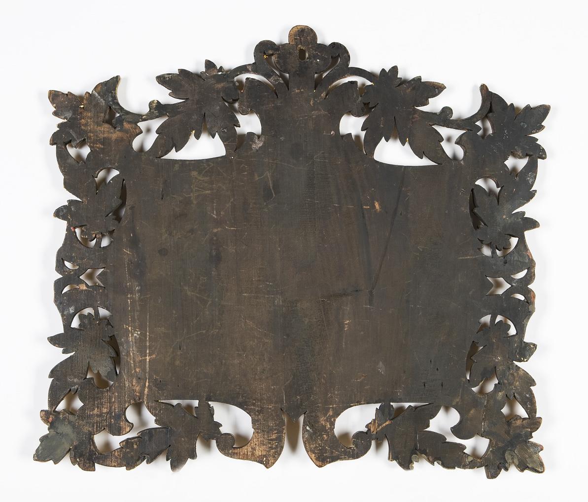 Openwork, set in gold, painted in color. Briskly painted arrangement with pumpkin, grapes, plums, peaches and bird on branch in a powerful coloring.