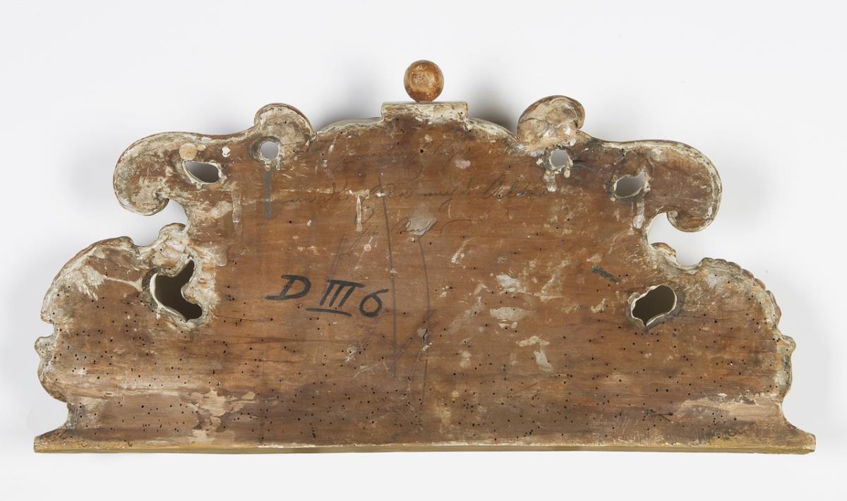 Painted white and gold, cartouche with colored coastal landscape. Curved baroque form with volute and rocaille decoration. Indistinctly inscribed in pencil on the reverse. Slightly domed, the frame replaced, partially restored.