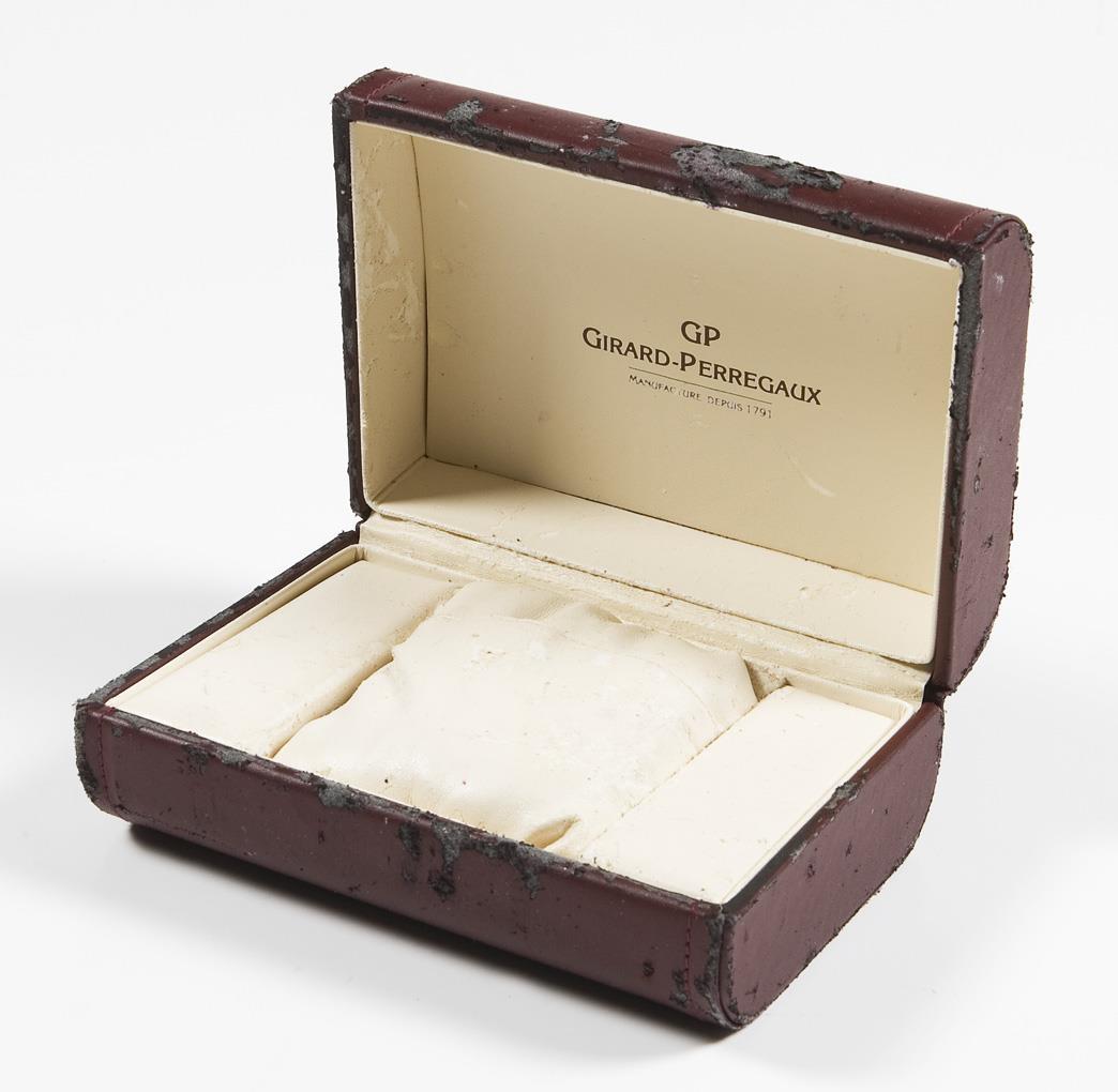 Automatic movement, water-resistant to 100 meters. Dial with applied gold Roman numerals, date window, large second, luminous hands, original bracelet with double folding clasp. Original box, cardboard box, three brochures with instructions for use, guarantee booklet. Automatic movement functional in short time test, date setting defective. The coating of the box has dissolved on the outside and inside, box dirty.