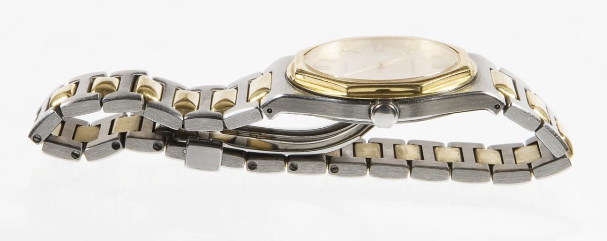 Stainless steel and 750 yellow gold (18 ct). ø 36 mm. 115 grams.