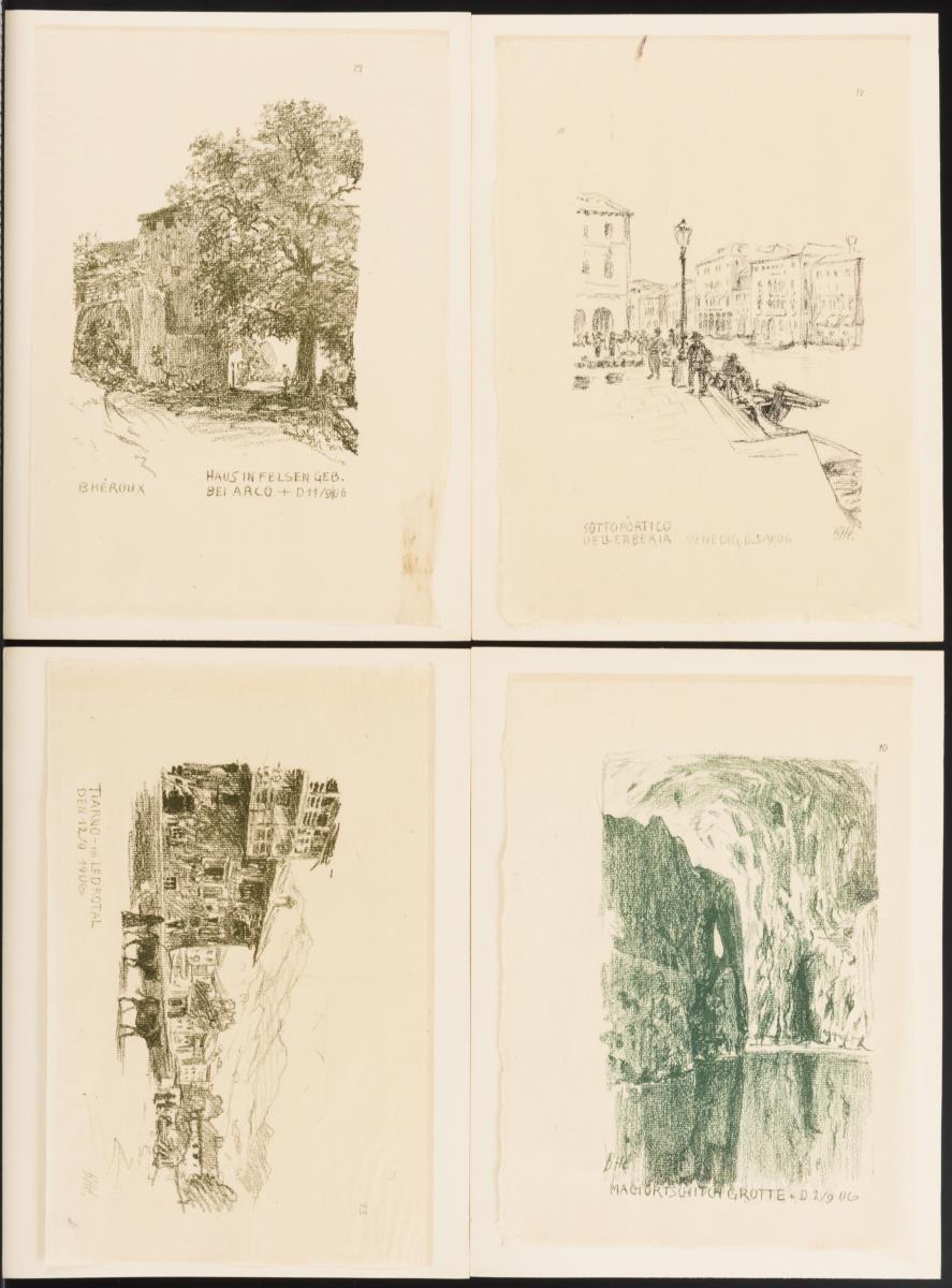 25 von 36 Lithografien auf Dünndruckpapier, auf Trägerkarton geheftet, 1 Einlegeblatt, Exemplar 12/80, Blatt je 24 x 32 cm. Es fehlen die Blätter 2, 4, 5, 6, 13, 16, 17, 18, 26, 29 und 35. In silbergrauer Kassette. n Bruno Héroux (1868 - 1944), deutscher Maler, Grafiker, Schrift- und Exlibriskünstler. nicht vollständig.