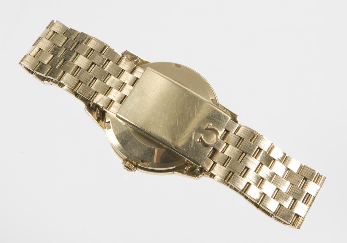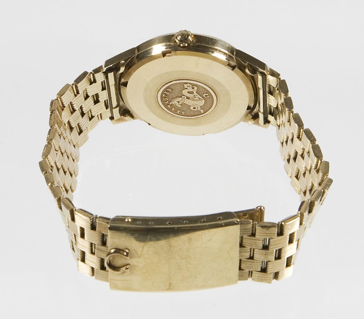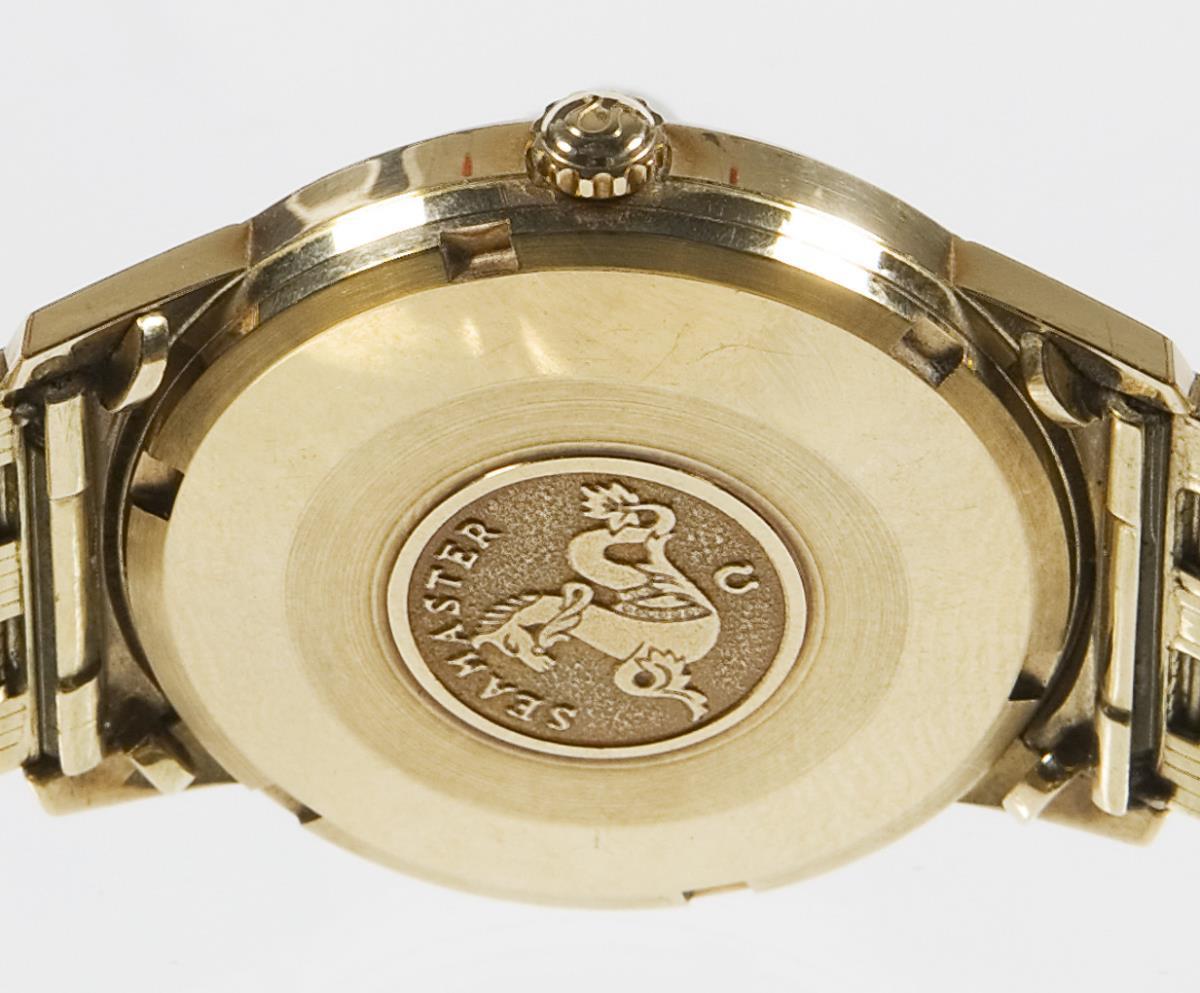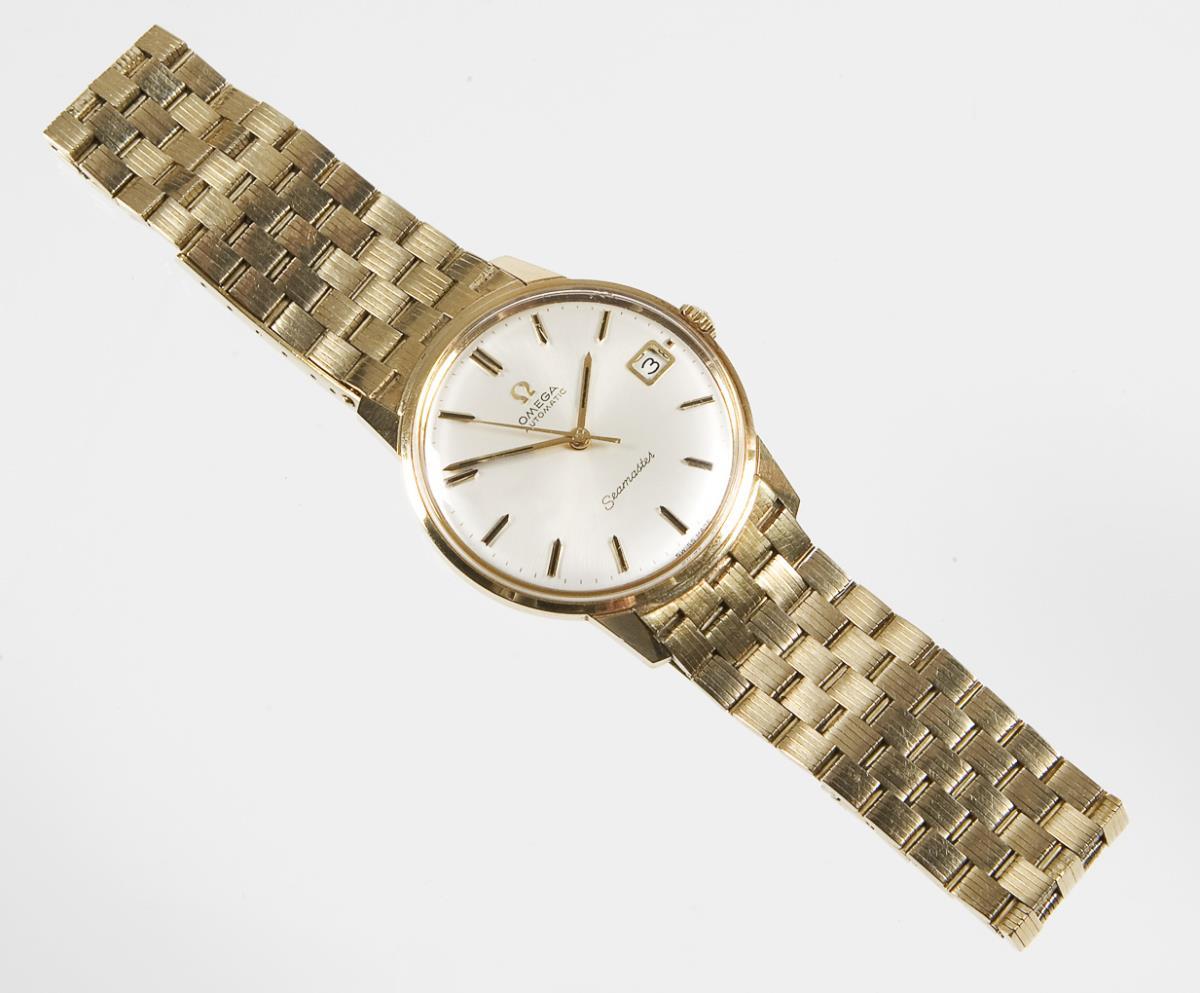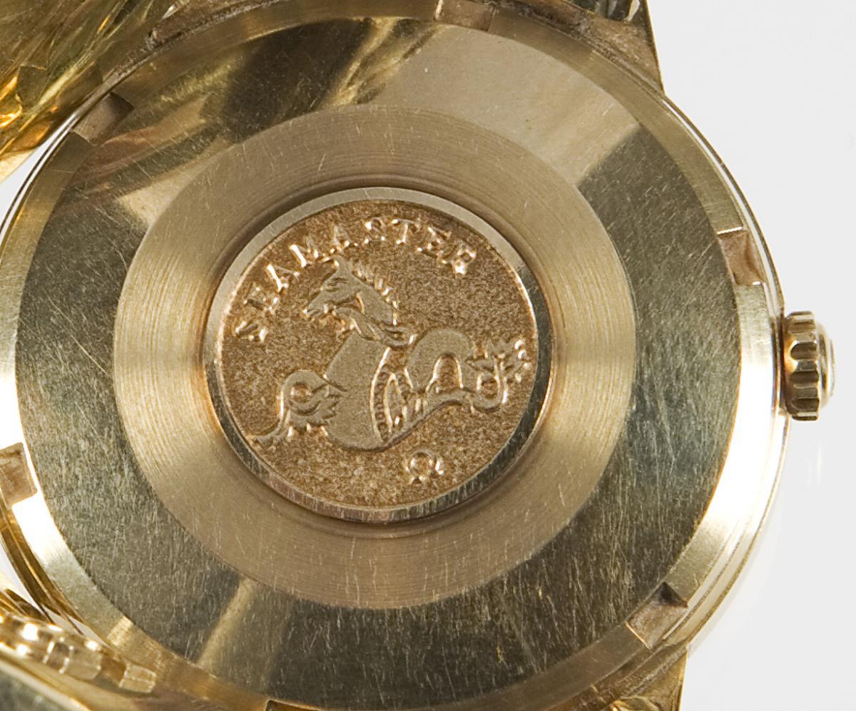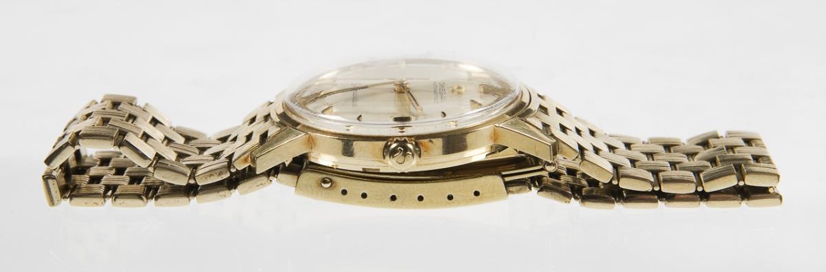 Automatic movement, dial with applied hour markers, large second, date window. Original gold bracelet with folding clasp. Timeless classic model from the early days of Seamaster production. Functioning in the short time test.