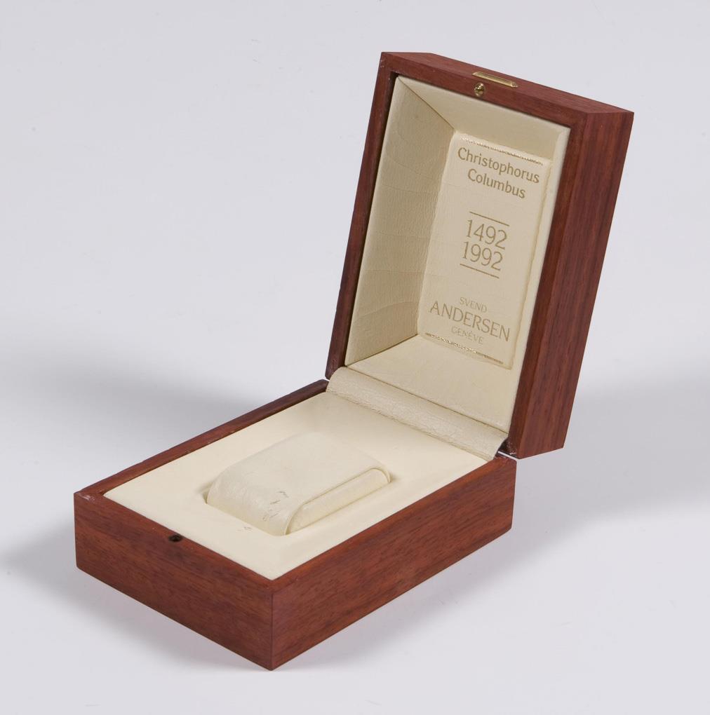 For world clock Christophorus Columbus 1992, limited to 500 copies. Cardboard with gold embossing, wooden box with brass plaque and thumb drive, bright interior, gold embossing in the lid.Internal coating of the box defective.