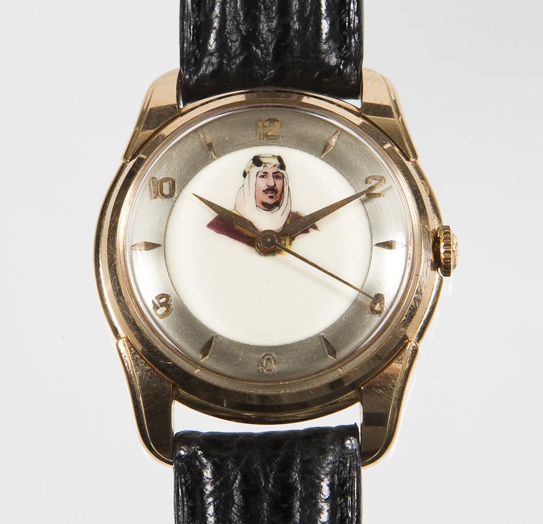 Wristwatch with portrait of King Saud ibn Abd al Aziz in gold. LONGINES.