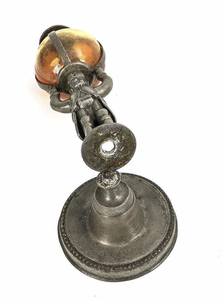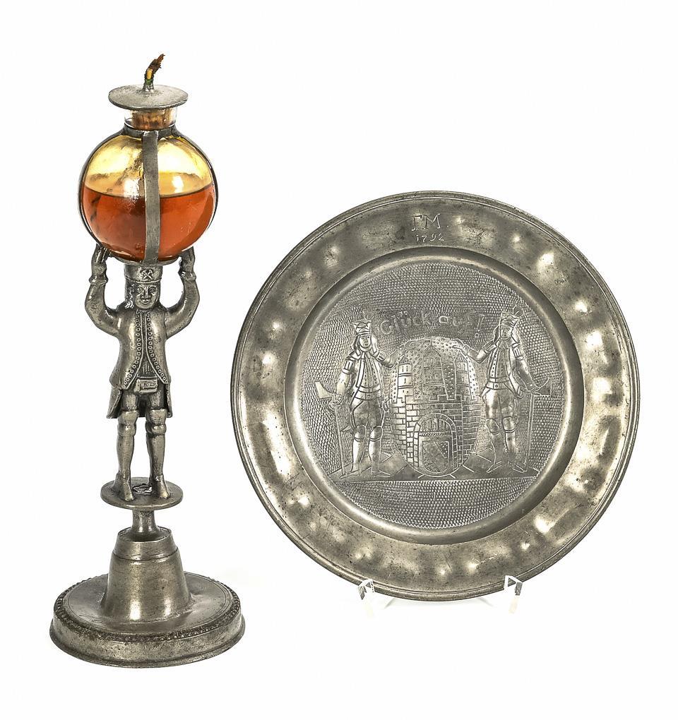 Miner standing on the round base with engraving "1838", carrying the oil container made of clear glass with his hands raised on his head. The foot with the hallmark of Johann Gotthelf Friebel in Leipzig / plate with embossed miners on the embossed city coat of arms of Prague(?) and the inscription "Glückauf" over a braided ground; humped flag with engraving "FM 1792", verso hallmark of Josef Neidhardt in Schlaggenwald. Soldered joint between foot and miner detached, some dents on the foot.