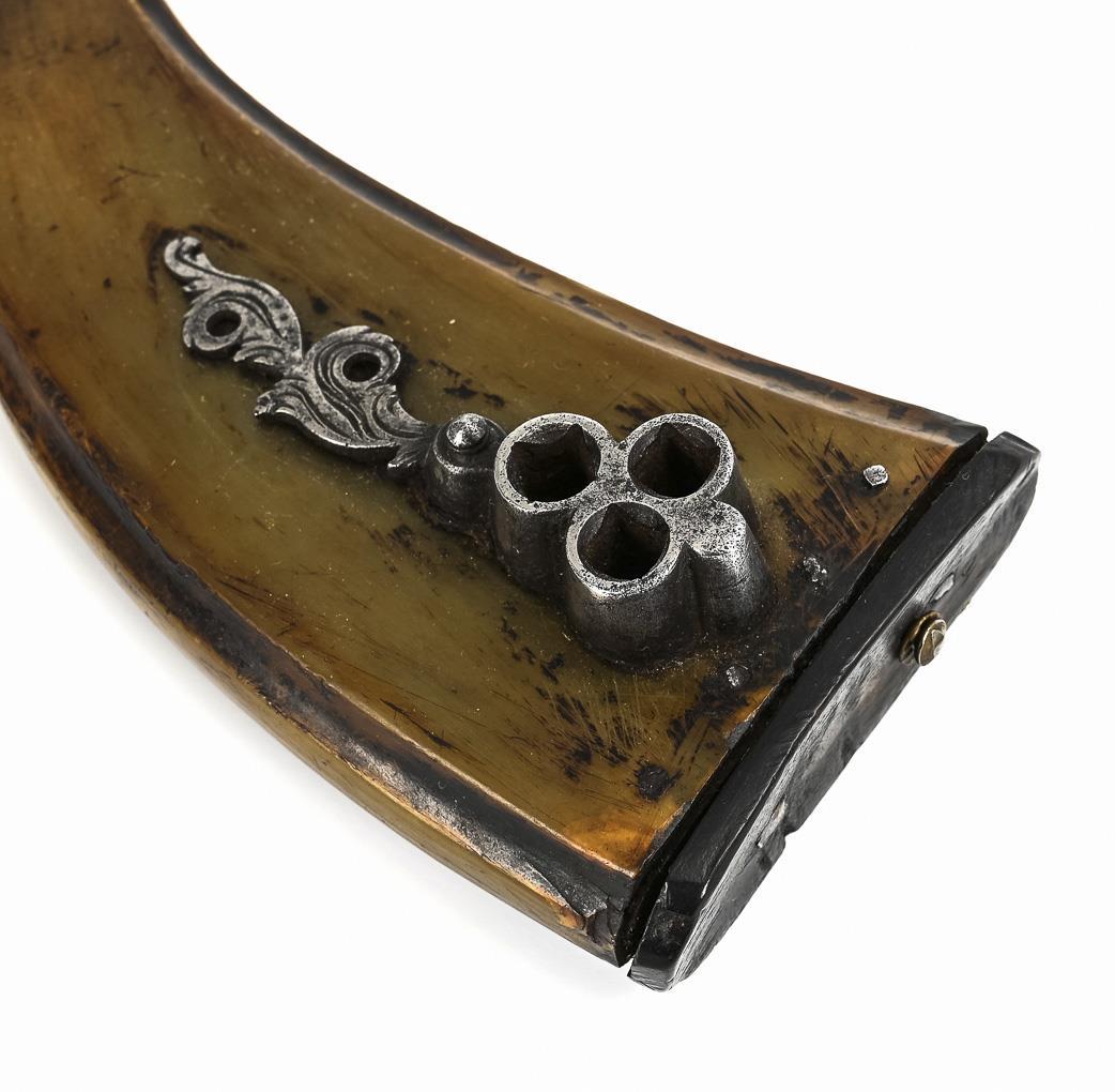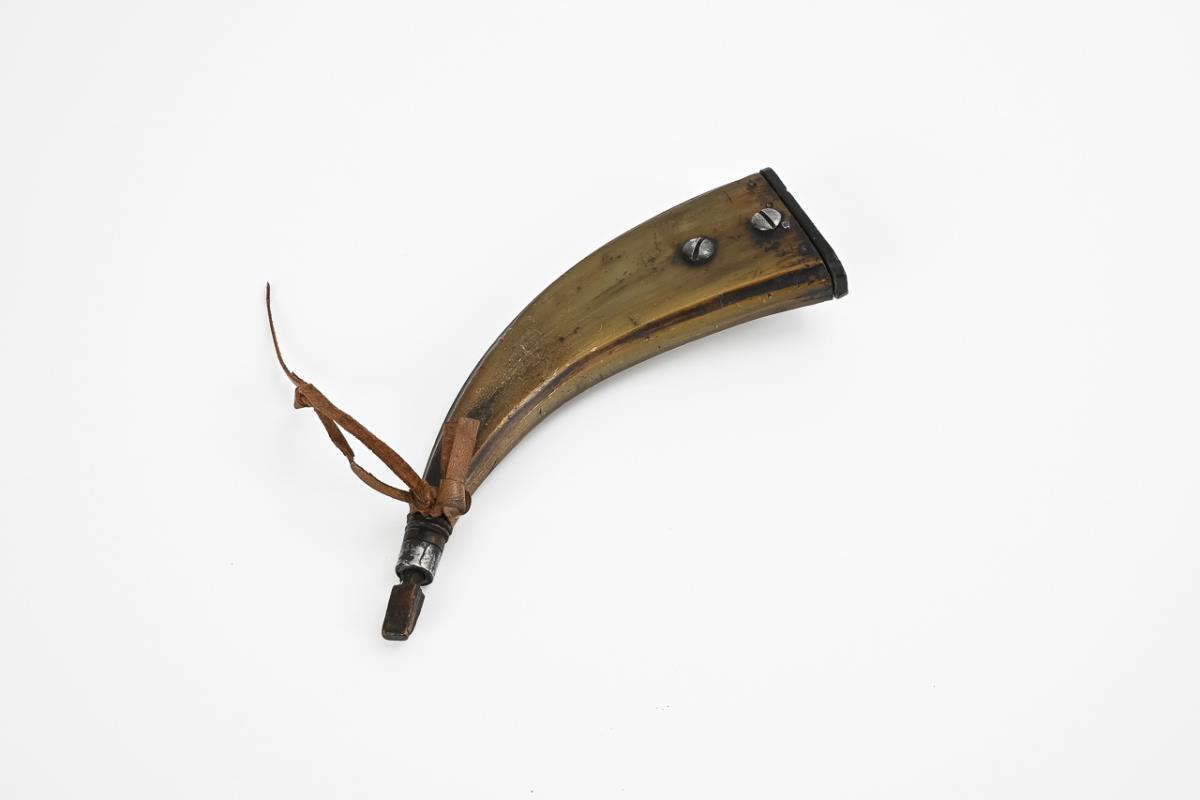 Flat powder horn with applied iron-cut leaf vine and wheellock key (3 square sizes). Some signs of age/use.