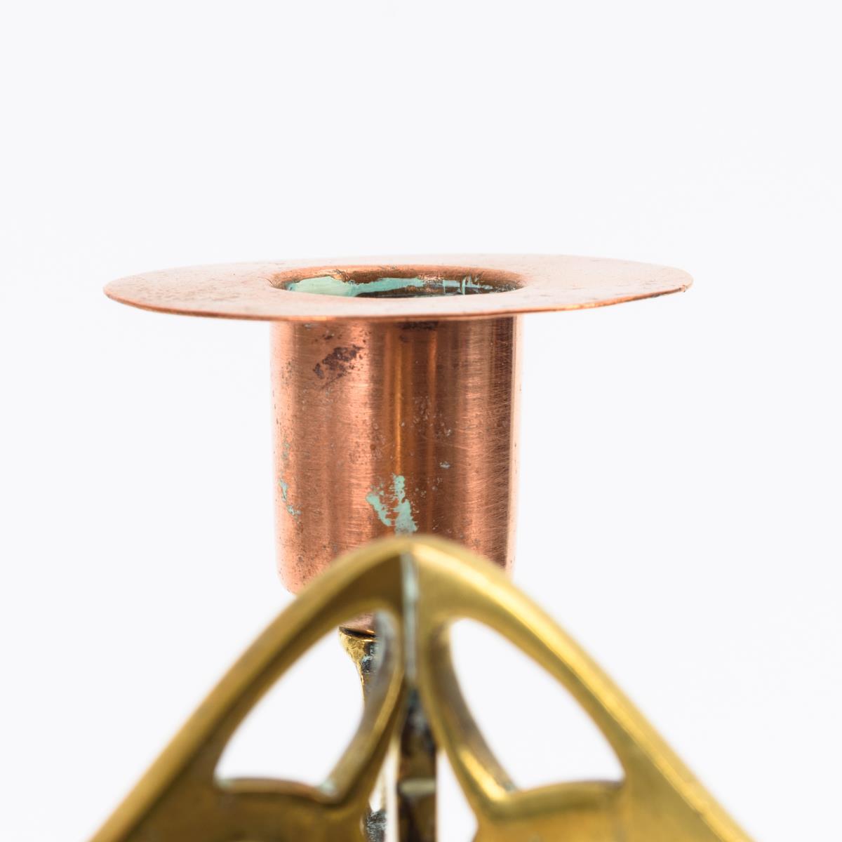 Schalenförmiger Kupfer-Rundfuß, Messing-Streben, die abgewinkelt in die 3