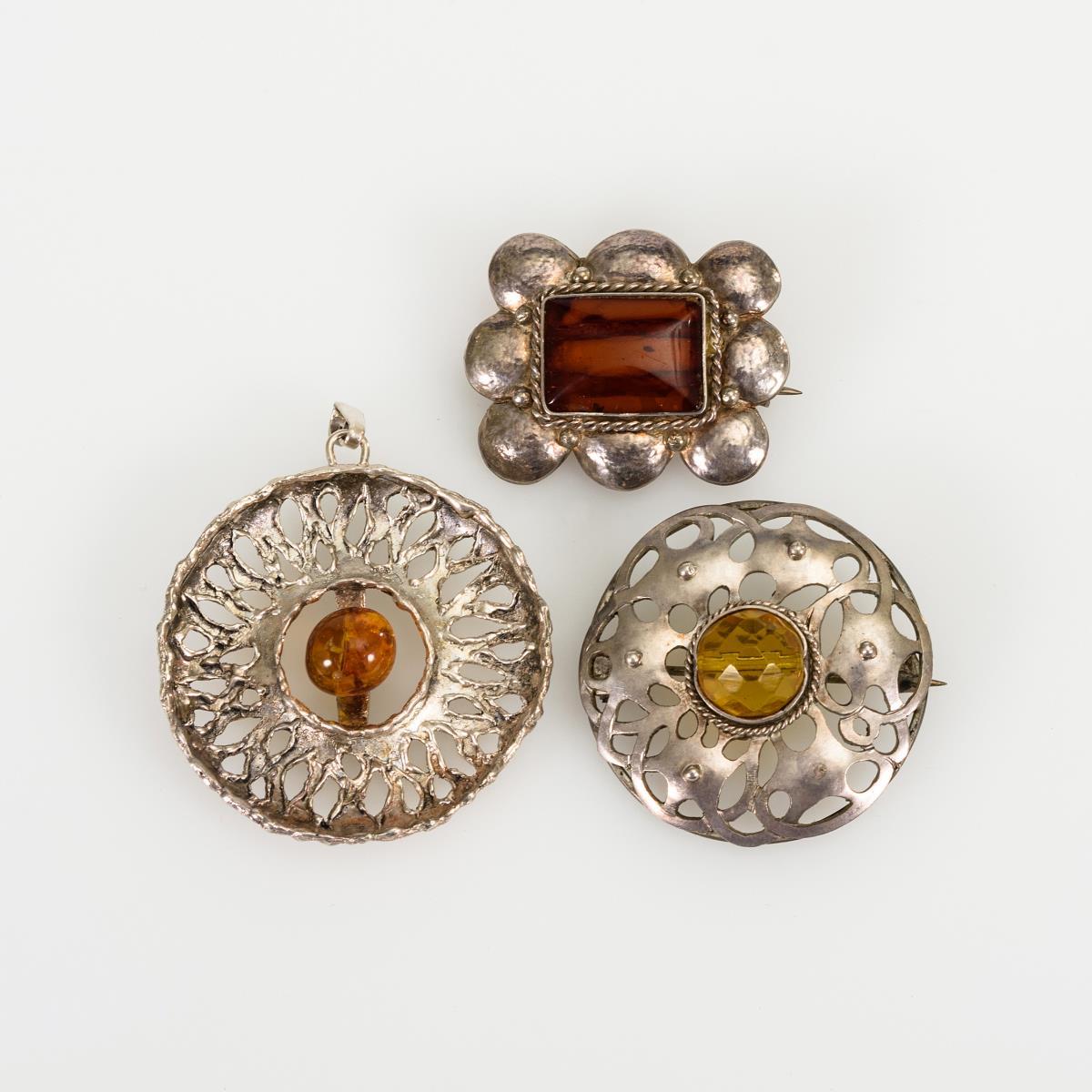 Durchbrochener Anhänger und Brosche mit gelben Bernsteinkugeln (1 ergänzt,
