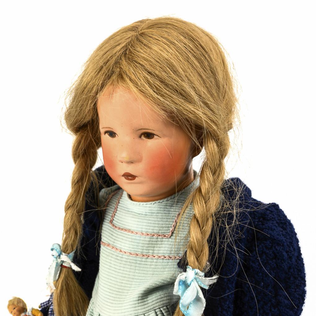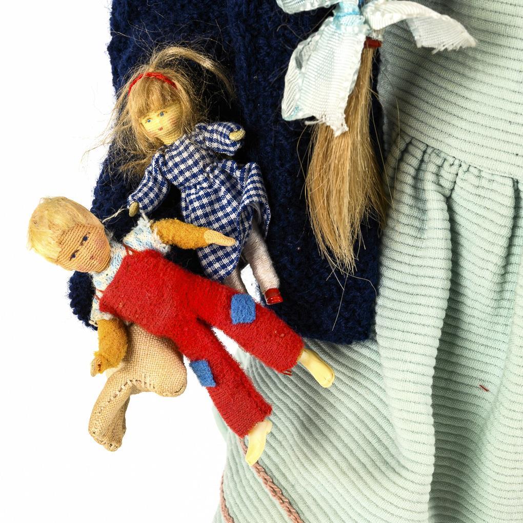 Painted crank head, brown eyes, blonde human hair wig, fabric body. Mint green dress, dark blue cardigan, white patent leather shoes. Enclosed 2 small dollhouse dolls. Wig partly detached, body stained.