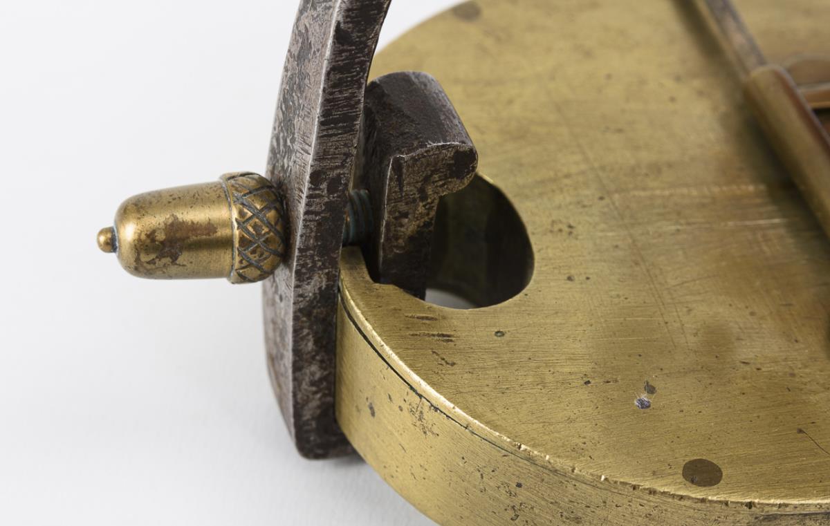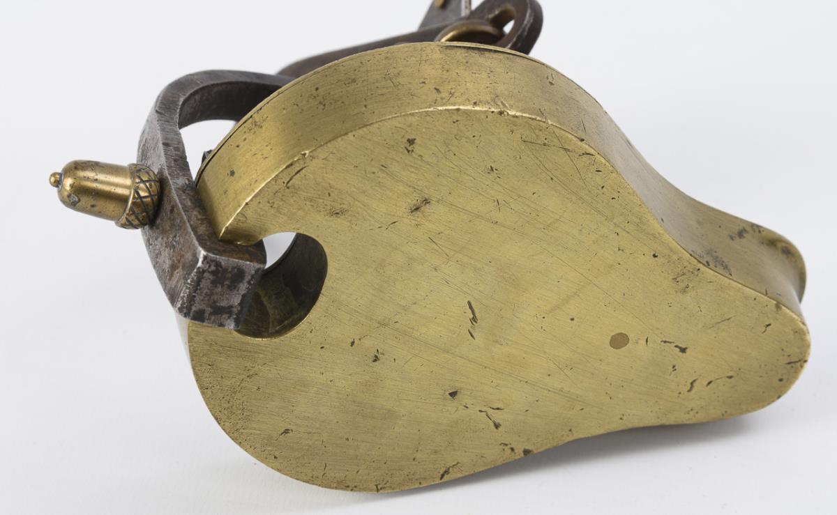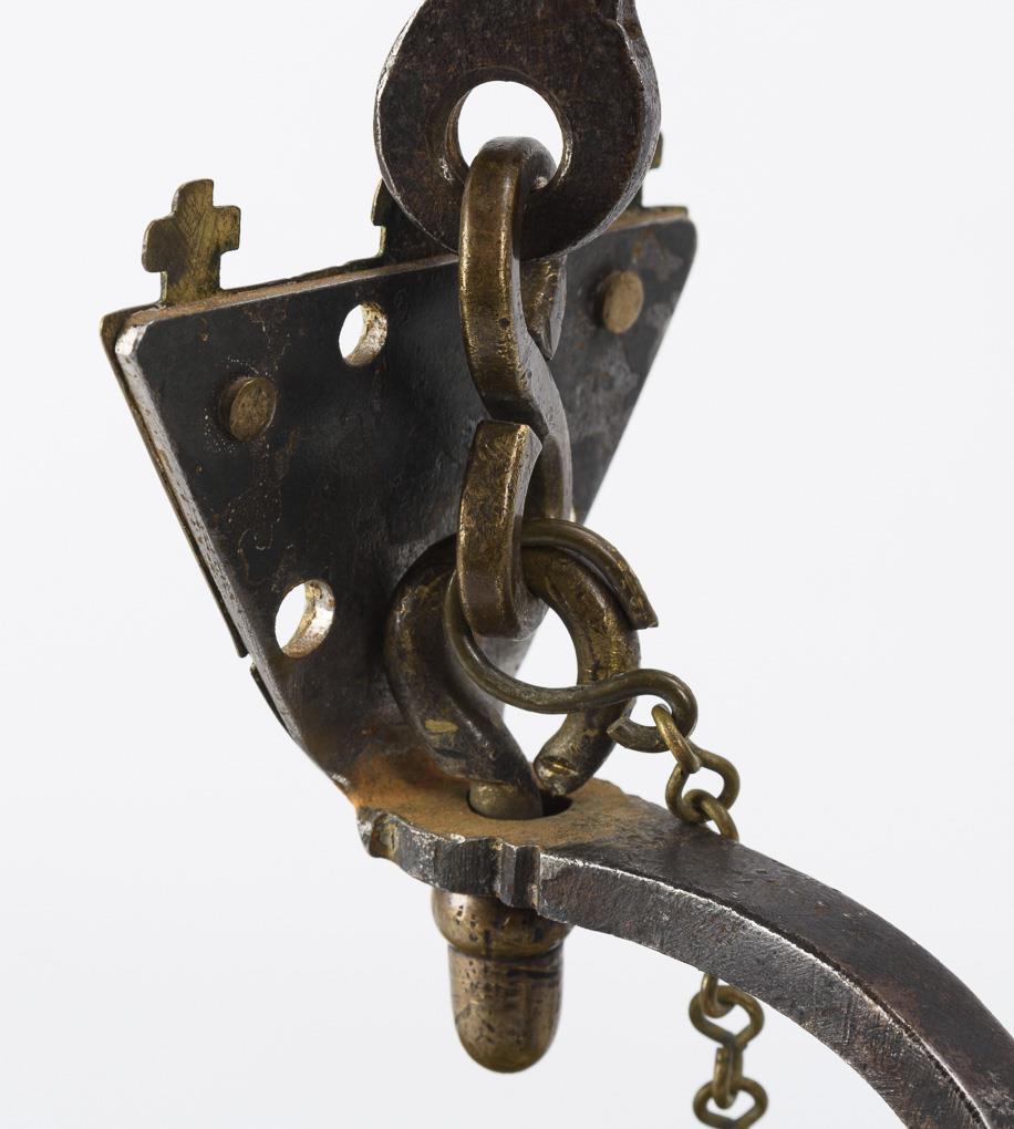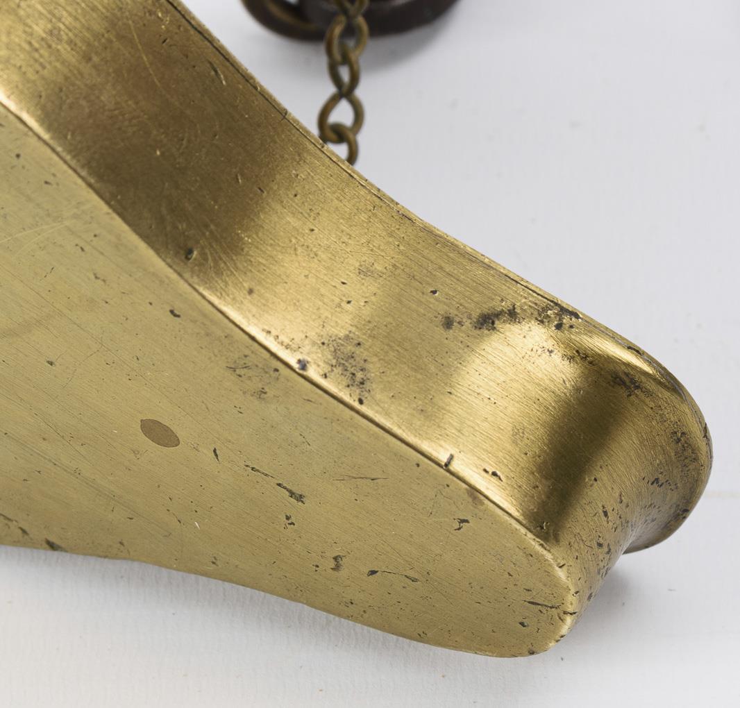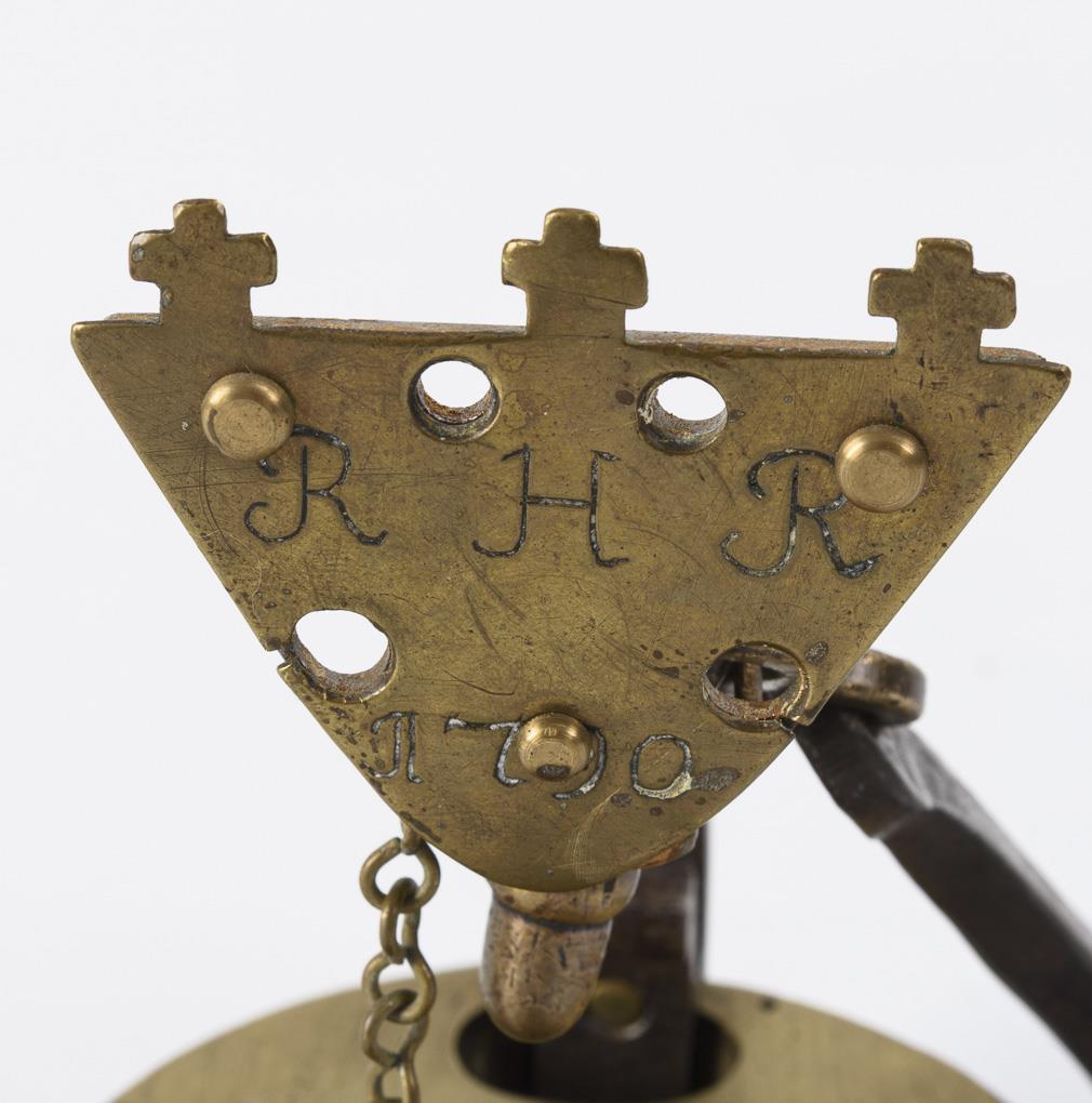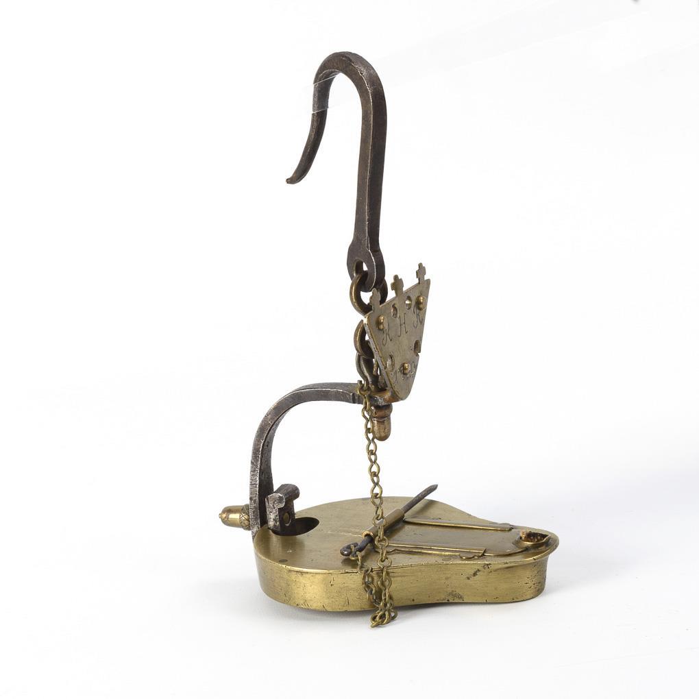 Honorary lamp for firing the oil with wick snuffer on the closed pot; on the sliding lid, sleeve for the wick holder on the brass chain. Brass wick tongue soldered to the inside of the base. A bracket with a triangular escutcheon mounted in the rear grip hole of the pot by means of an acorn screw, a triple riveted brass escutcheon with 4 decorative holes and 3 crosses on the upper edge as well as engraving. The brass swivel with acorn pivot bearing and S-shaped intermediate link attached to the carrying point hook. Some signs of age/use.