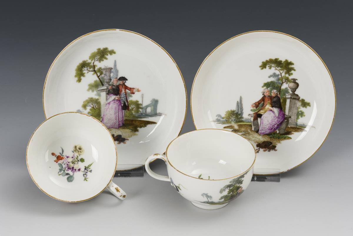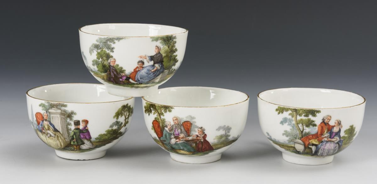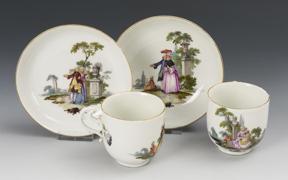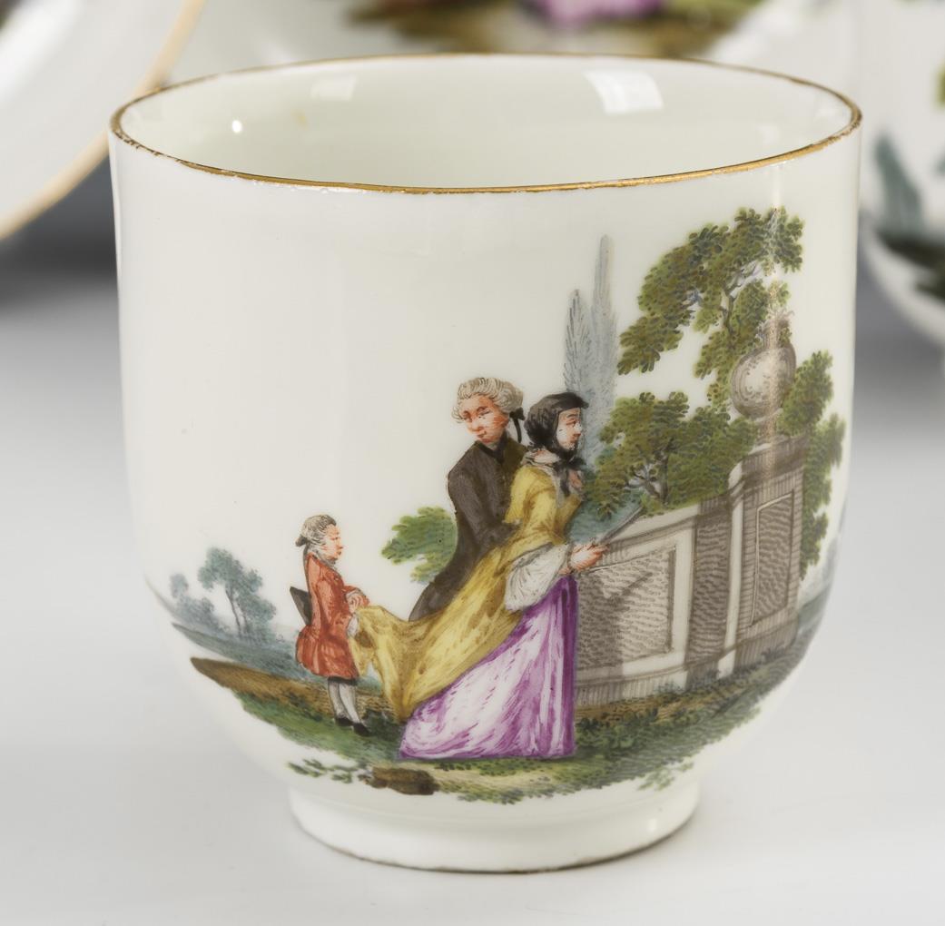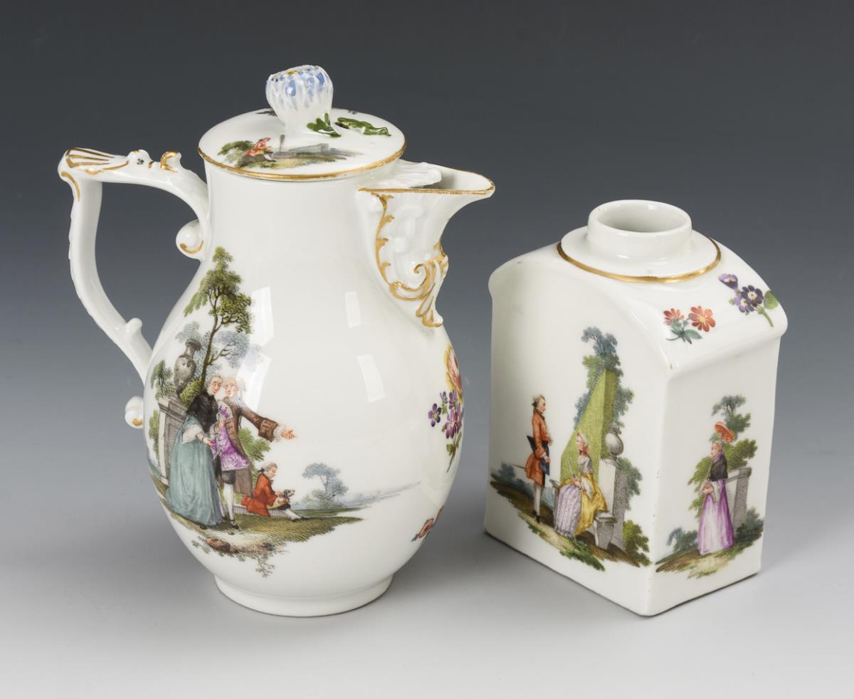 All with the finely painted depiction of gallant couples in park landscapes. Pear jug with rocaille handle, snood and pommel lid (h 14.5 cm), tea caddy (without lid; h 10.5 cm), 2 coffee cups with rocaille handle (h 7 cm) and original saucers (Ø 13.5 cm), 4 bulbous cups with ear handles (H 4.5 cm) and original saucers (Ø 12 cm) and 1 quatrefoil bowl (L 17.5 cm). Partial wear to the gold, lid knob chipped, bump to the snipe, minimal bump to 1 saucer rim and 1 cup rim, glued chip to 1 saucer rim, 2 cups with small stand ring bumps, hairline crack to 1 cup handle.