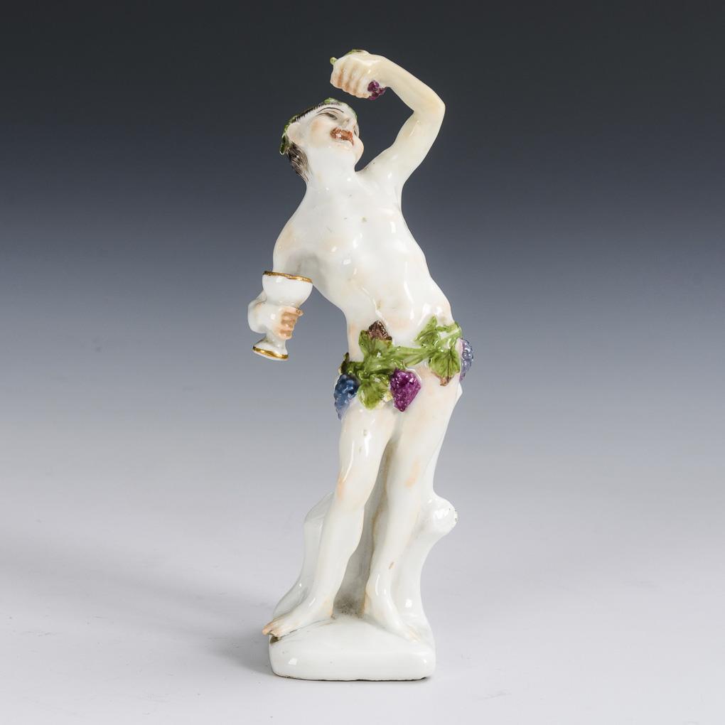 Standing bacchant with grapes and wine goblet. 1 toe and 1 leaf chipped, small glaze defect at the mouth.