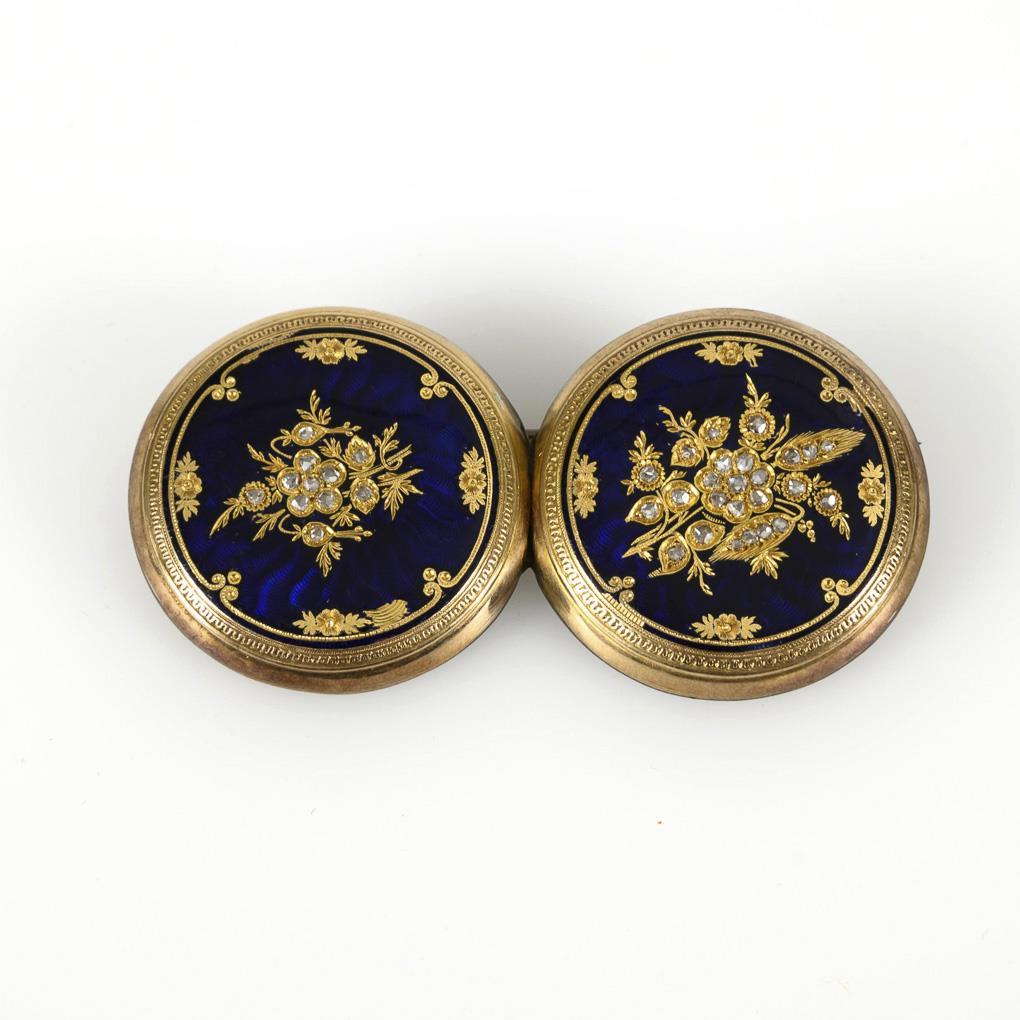 Brooch designed from an antique watch case with small diamond roses in floral engravings between blue enamel. Ball hook.