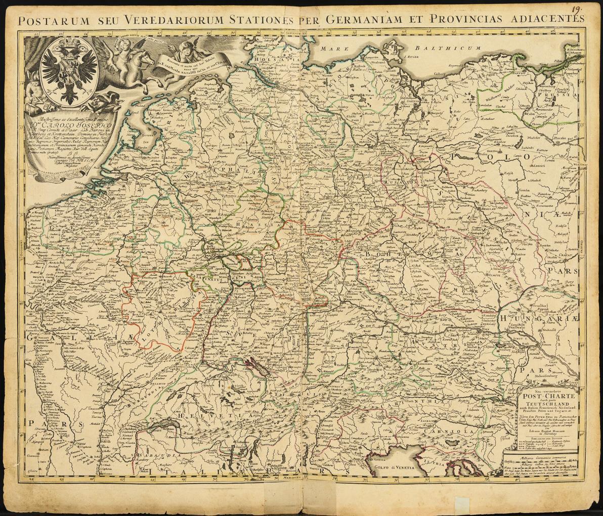 Detailed, at the time pioneering map by the Supreme Field Postmaster Johann Peter Nell zu Damenacher (1672 -1743) with postal routes and postal stations through Germany, with the neighboring countries, heraldic title cartouche "Illustrissimo ac Excellentissimo Domino Dno Carolo Josepho [....]", with title in Latin at upper margin "Postarum seu Veredariorum Stationes per Germaniam et Provincias Adiacentes", title in German at lower right "Neu-vermehrte Post-Charte durch gantz Teutschland nach Italien, Franckreich, Niederland, Preußen, Polen und Ungarn etc.", legend and mileage indicators, ca. 1720. Sheet foxed, backglued centrefold, margins browned and partly backglued.