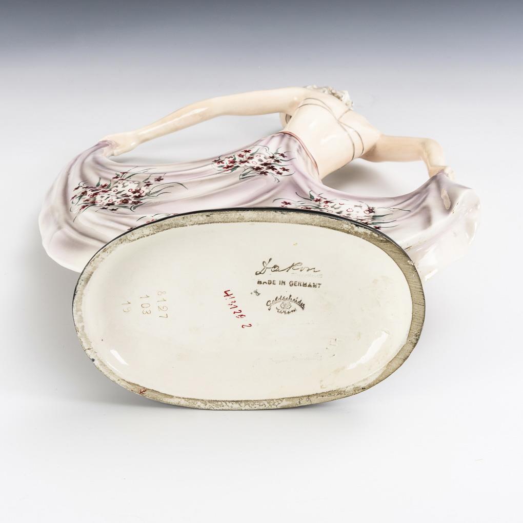 Dancer with bikini and skirt with floral pattern held up for dancing, on a black oval base. The model for this figure was probably the actress Lida Baarova (actually Ludmilla Babkova, 1914-2000), who became famous in Germany for her film "Barcarole" (1935) and her love affair with Joseph Goebbels. Because of the latter, she was expelled back to Czechoslovakia by Adolf Hitler in 1938. Although Baarova had dark hair, the manufactory designed the figure with light hair, as this seemed to be more in keeping with the "German taste" of the time. Probably retouched burn mark on the neck, right ankle with fine crack, left shoe with glaze crack, left finger with small glaze chip.