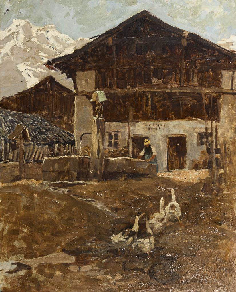 The animals in front of the alpine house in the sunshine with the mountains on the horizon.