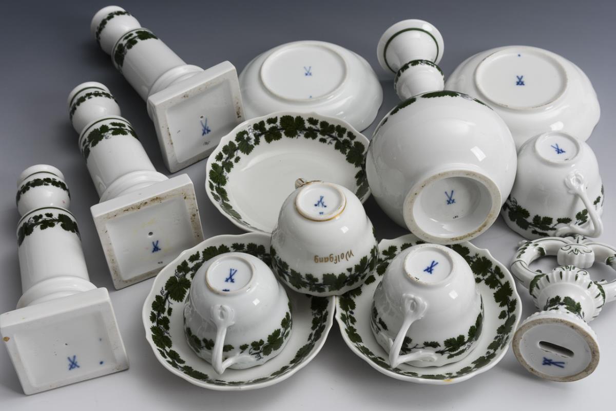 3 candlesticks, vase, 4 demitasse cups and etagere knob with vine leaf decoration. Meissen.