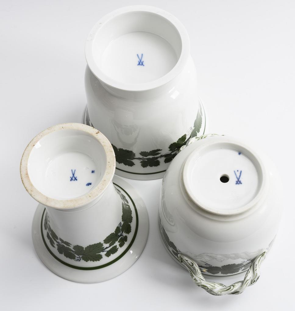 Vase and 2 cachepots with vine leaf decoration. Meissen.
