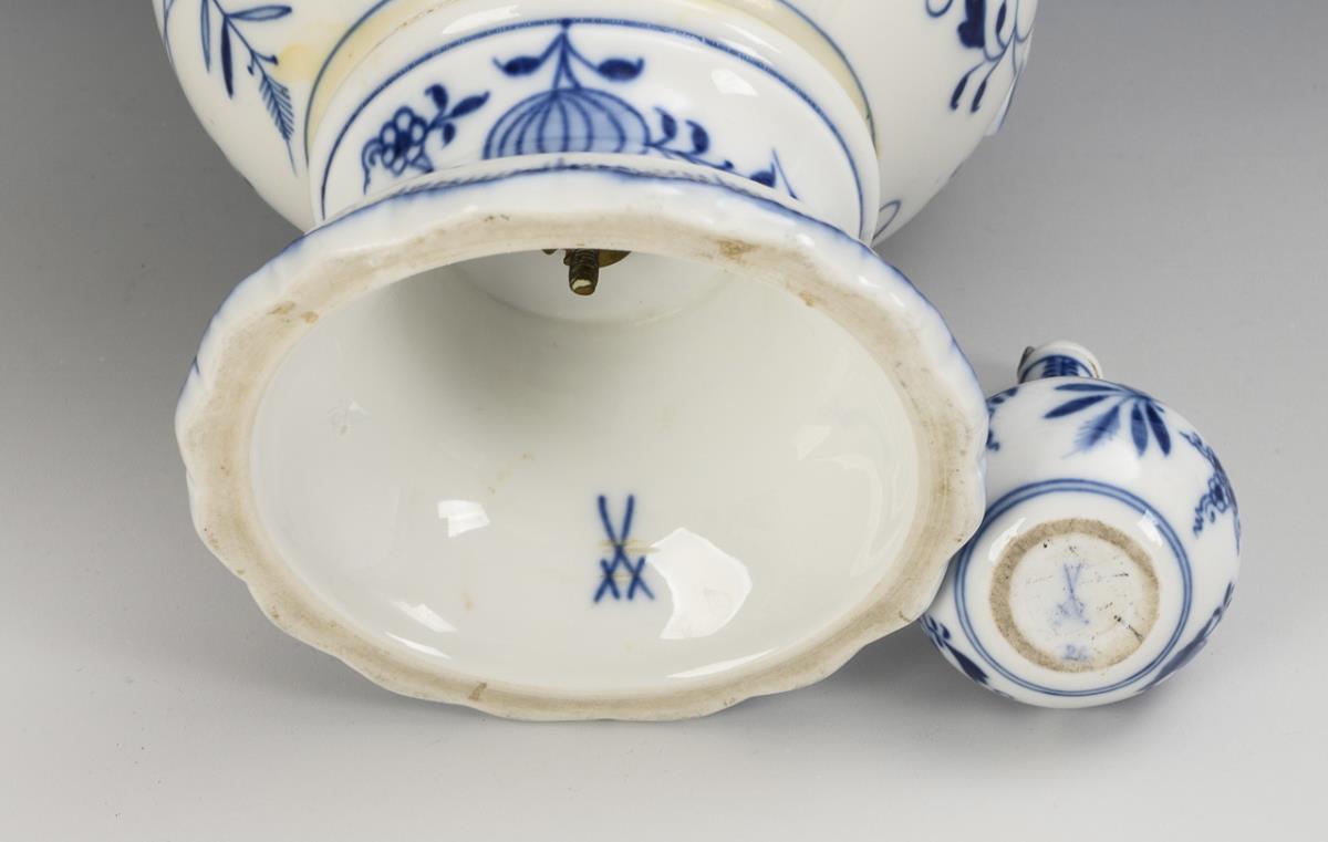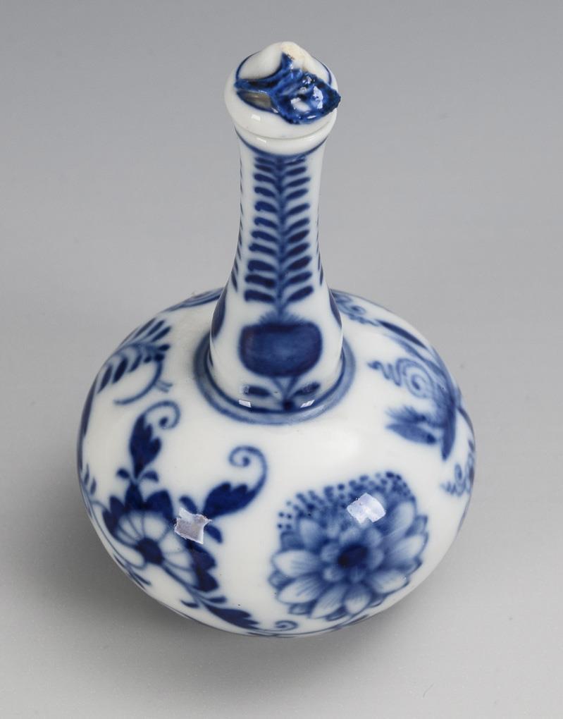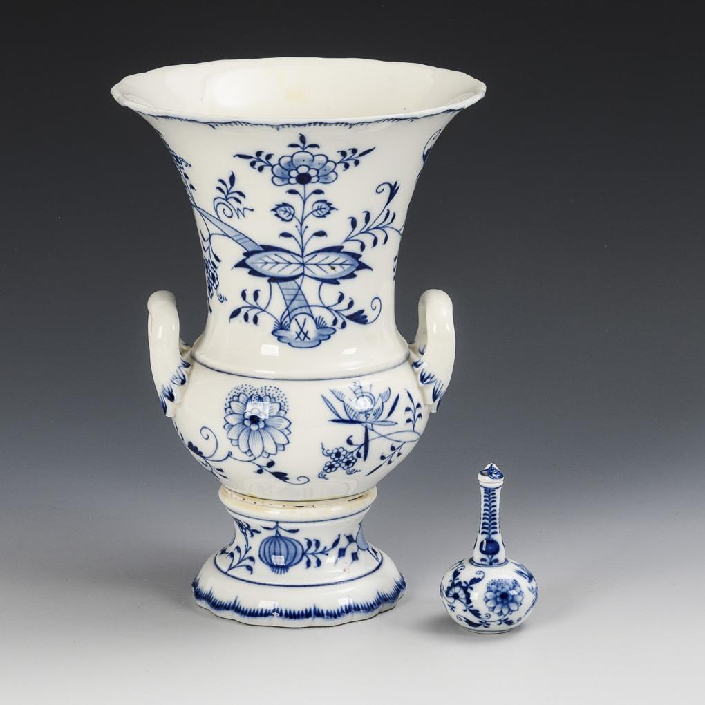 1x krater vase with two handles and round foot (h 24.5 cm). / 1x narrow-necked vase as flacon (H 8 cm). Knob of the flacon bumped.